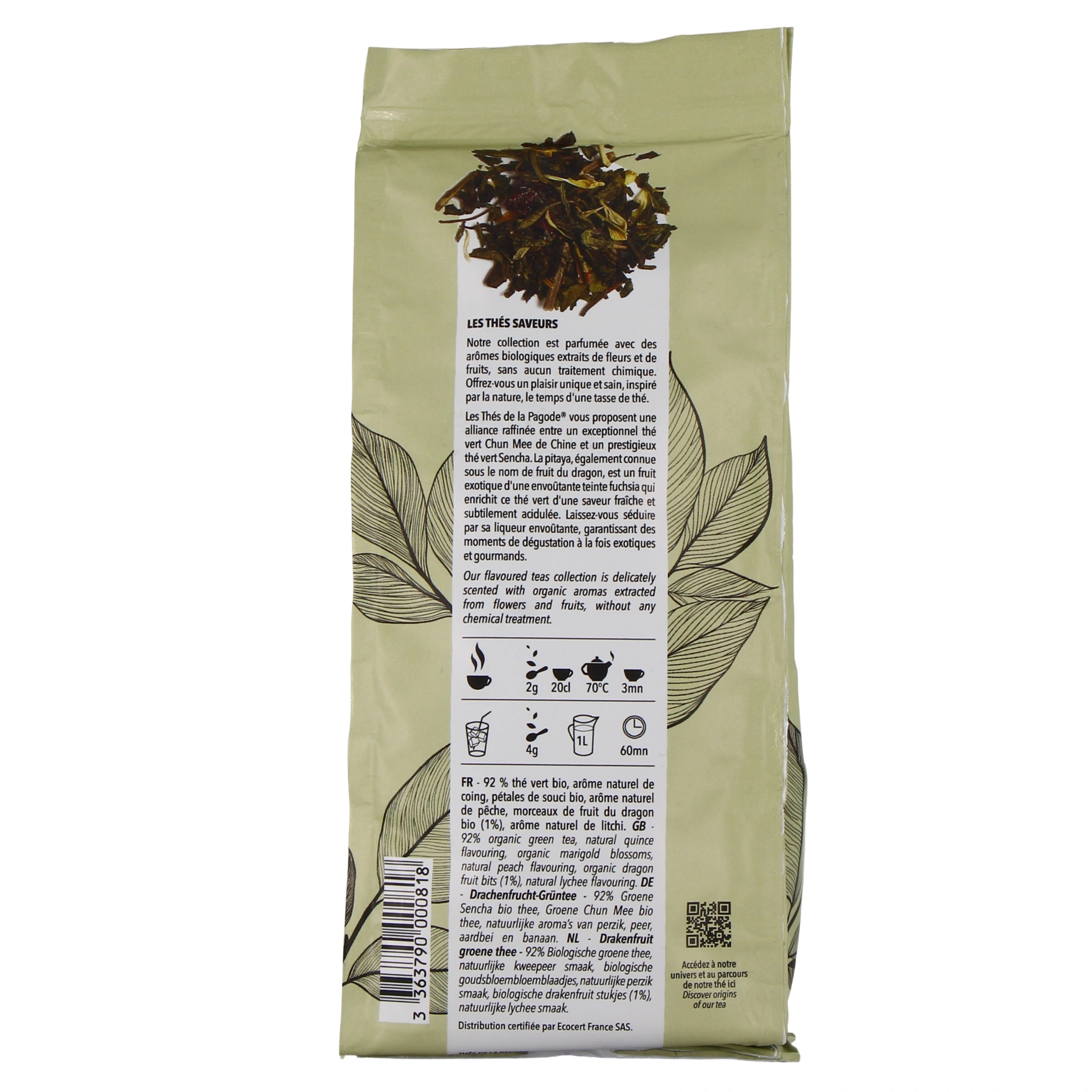 Le thé vert du Dragon Bio des Thés de la Pagode est un mélange unique dans lequel vous retrouverez un grand thé vert Sencha ainsi qu'un grand thé vert Chun Mee (tout deux en provenance de Chine), auxquels est associé le pitaya ou Fruit du Dragon, un fruit exotique à la jolie couleur fuchsia. Le résultat ? Un thé savoureux et doté d'un goût légèrement acidulé et frais.