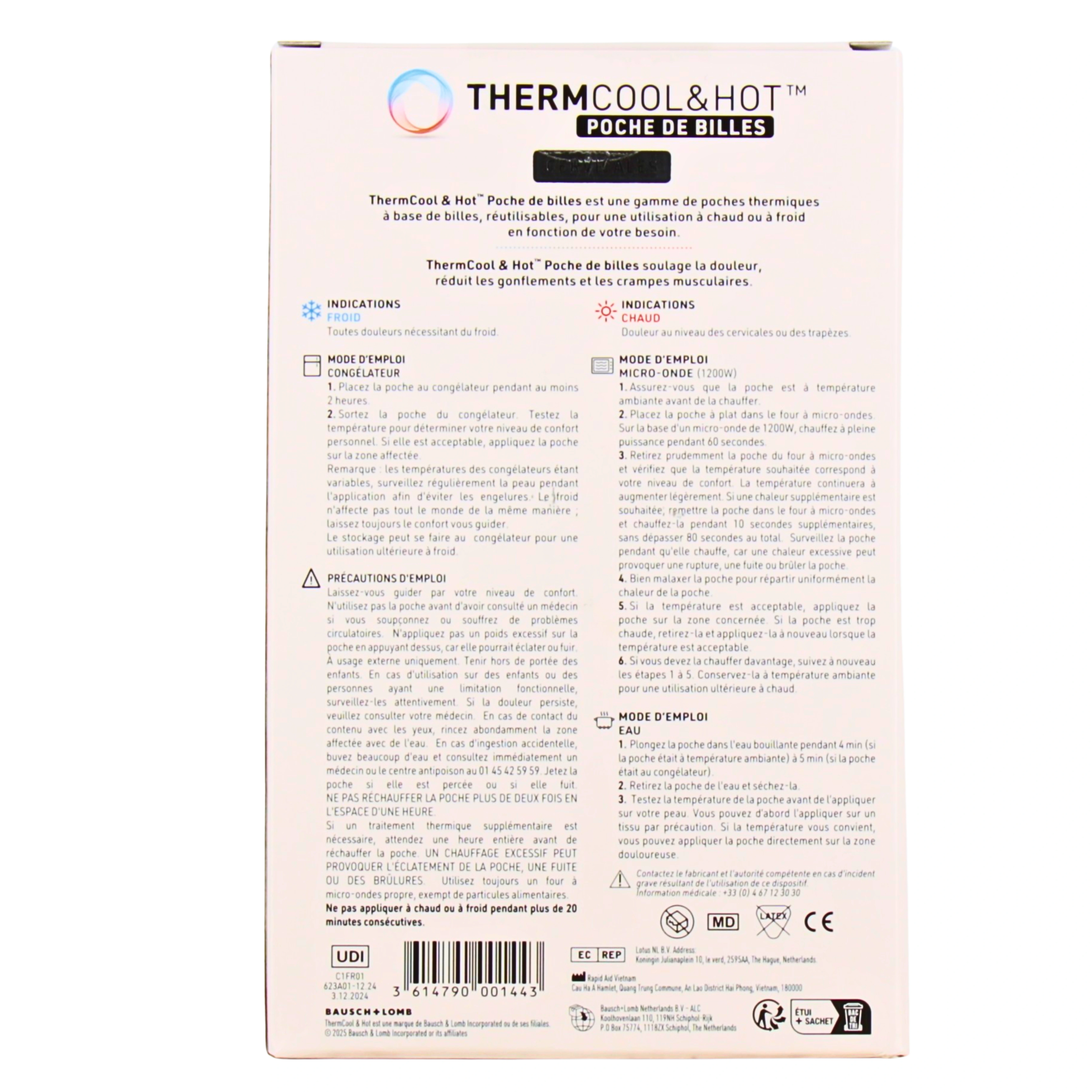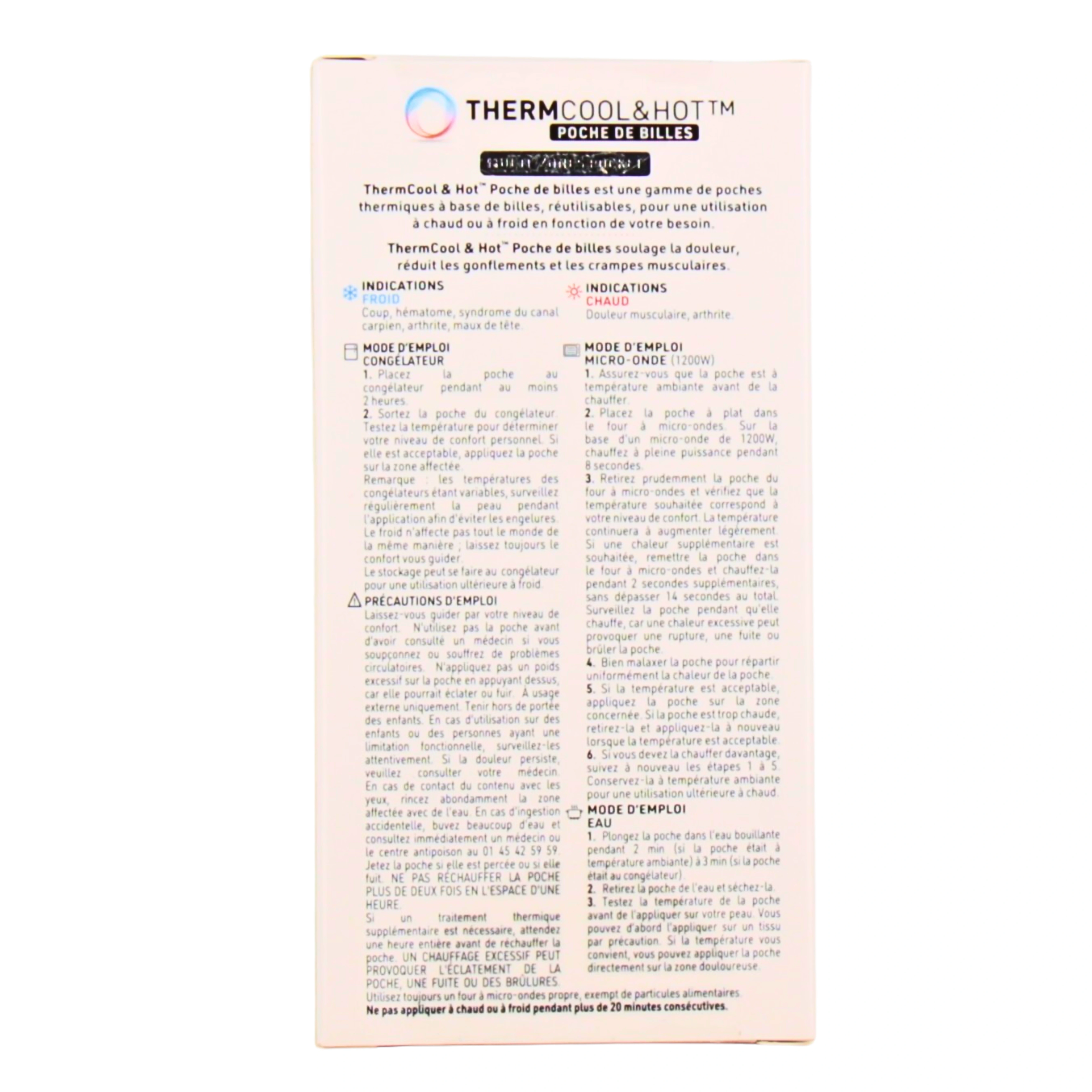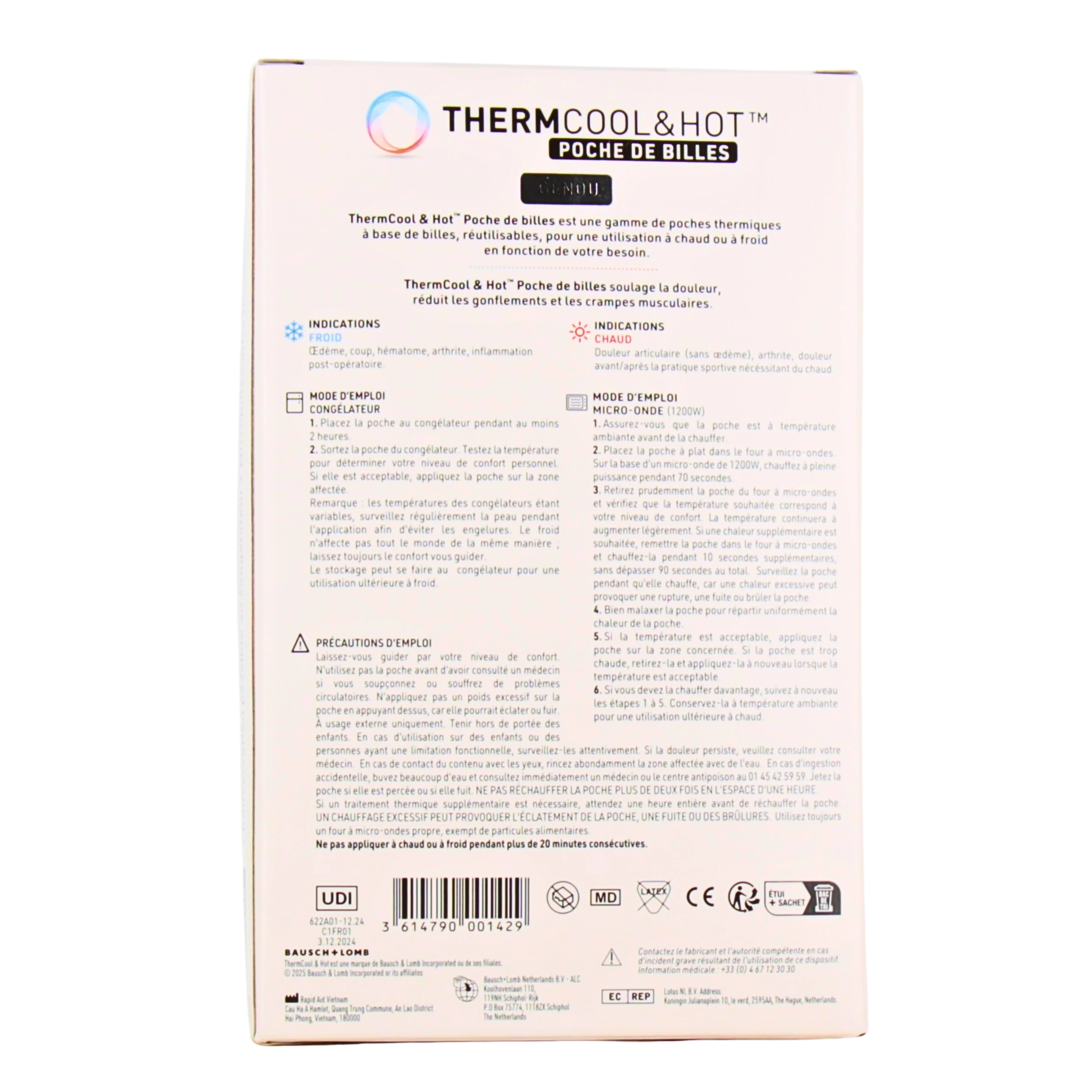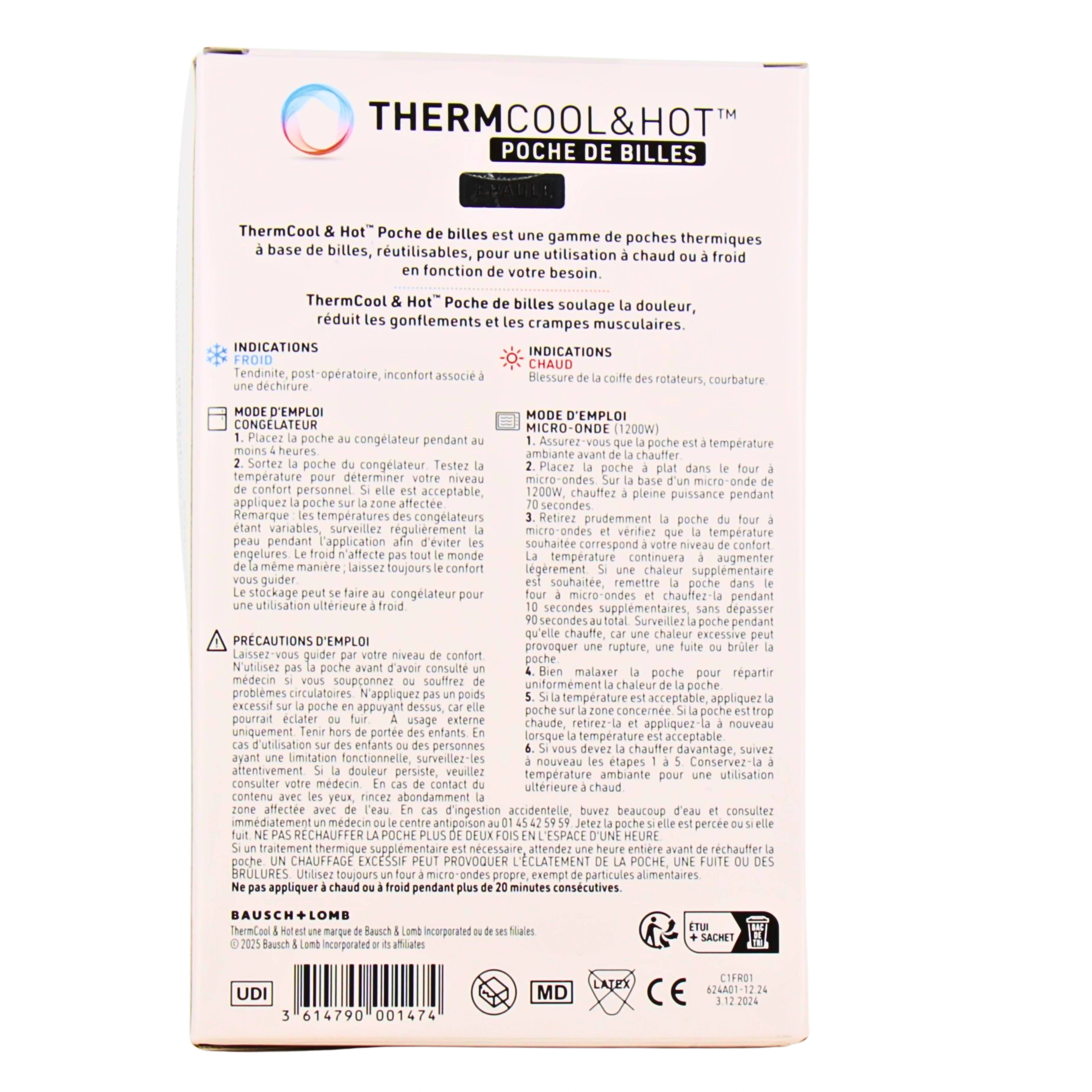 La poche de billes Thermcool & Hot est un dispositif médical du laboratoire Bausch&Lomb qui se décline en différents modèles pour soulager les douleurs de façon naturelle. Légère et maniable, cette poche remplie de microbilles flexibles s'utilise pour diffuseur de la chaleur ou bien de la fraîcheur et ainsi soulager différents maux.
