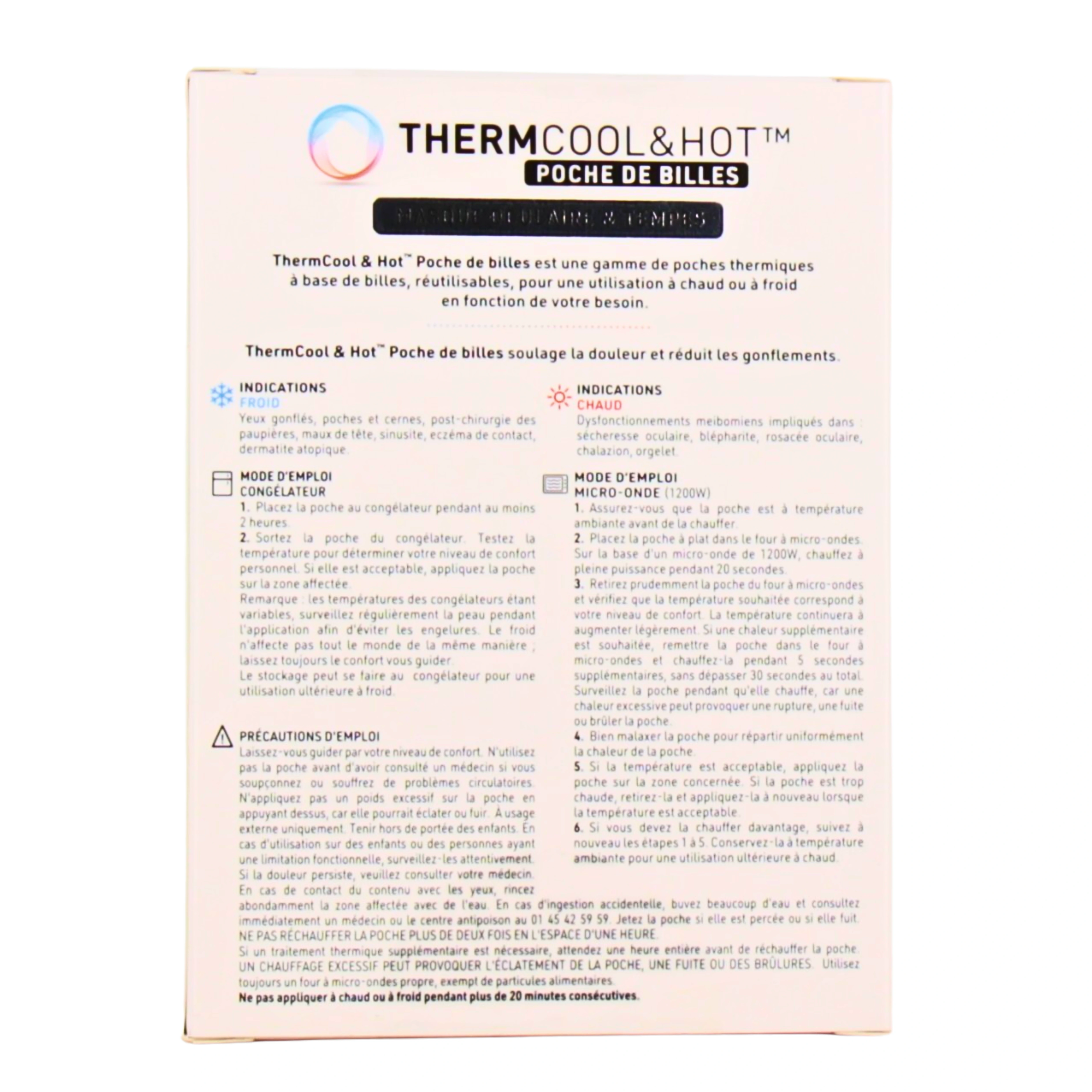 - La poche de billes Thermcool & Hot Masque Oculaire et Tempes est recommandé en cas de sécheresse oculaire, d'orgelet, de problèmes de sinus, de maux de tête ou de poches et de cernes. Son élastique ajustable garantit un maintien optimal, pour une action précise sur les tempes et le contour des yeux ;