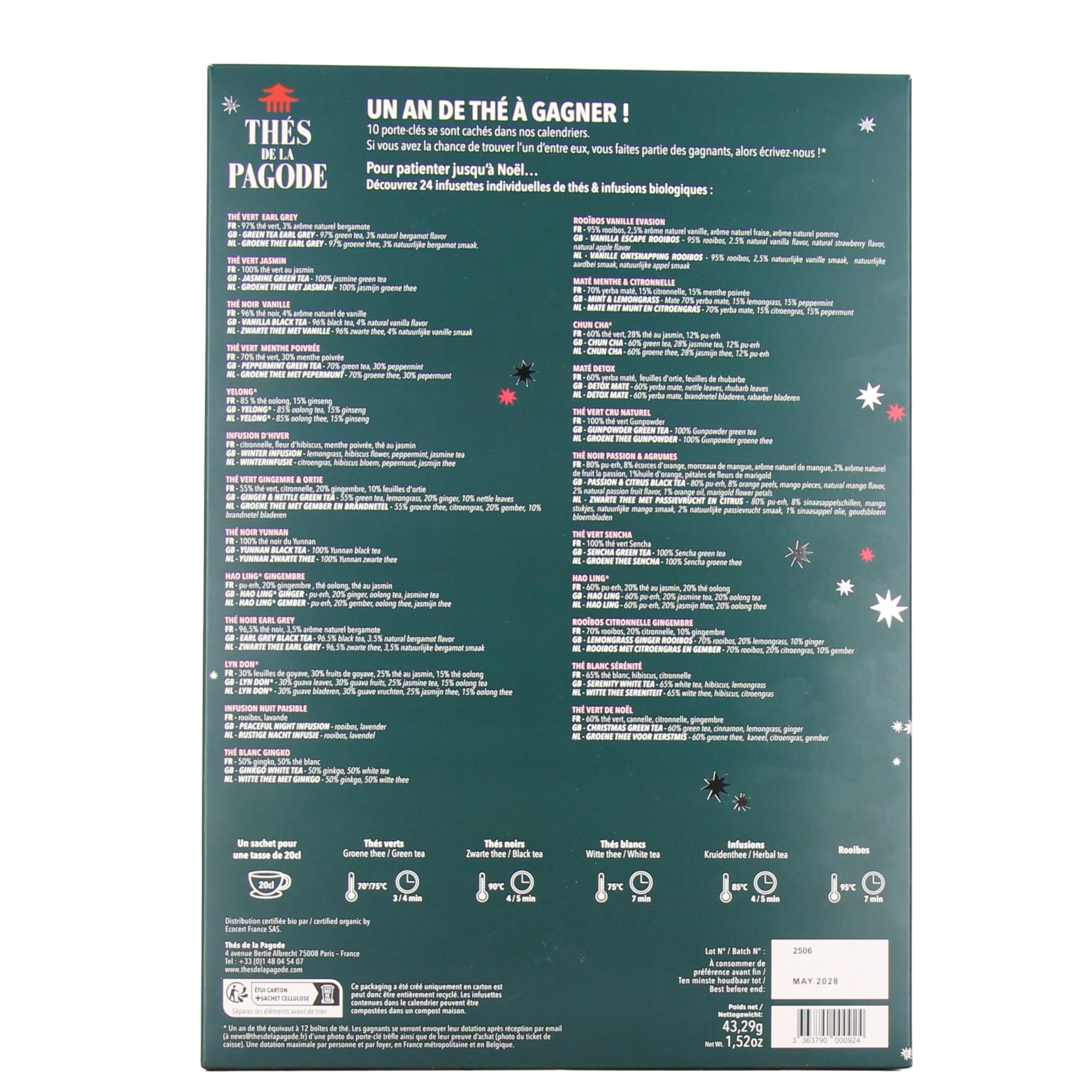 [Alerte Spoiler !] Derrière les 24 cases du calendrier de l'Avent Thés de la Pagode, vous trouverez : Thé Vert Earl Grey - Thé Vert Jasmin - Thé Noir Vanille - Thé Vert Menthe Poivrée - Yelong - Infusion d'Hiver - Thé Vert Gingembre & Ortie - Thé Noir Yunnan - Hao Ling Gingembre - Thé Noir Earl Grey - Lyn Don - Infusion Nuit Paisible - Thé Blanc Gingko - Rooïbos Vanille Evasion - Maté Menthe & Citronnelle - Chun Cha - Maté Detox - Thé Vert Cru Naturel - Thé Noir Passion & Agrumes - Thé Vert Sencha - Hao Ling - Rooïbos Citronnelle Gingembre - Thé Blanc Sérénité - Thé Vert de Noël. Un sachet pour une tasse de 20 cl :- Thés verts : 70/75°C - 3 à 4 minutes