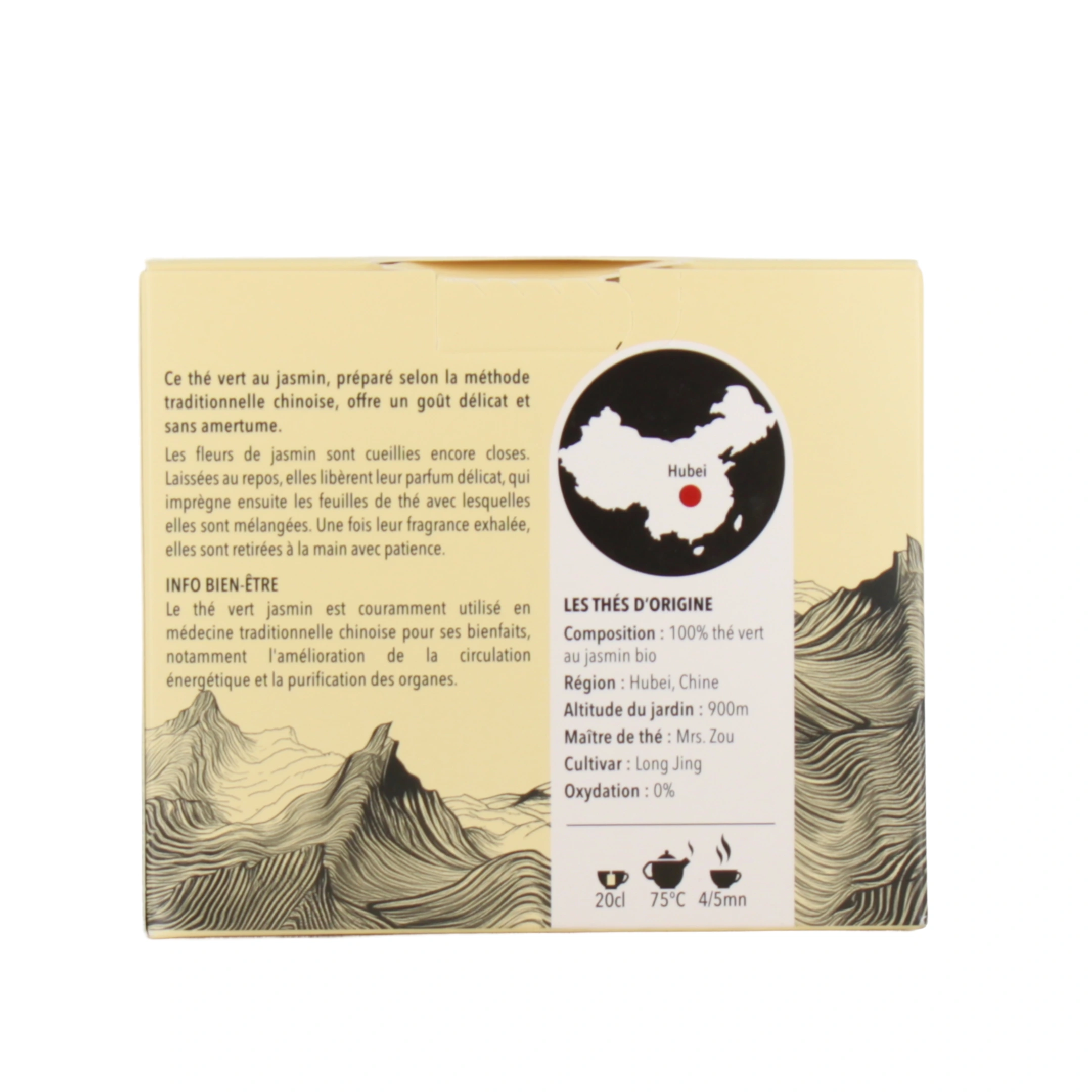 Afin d'obtenir une infusion subtile et fleurie sans amertume, les fleurs de jasmin est cueilli lorque les fleurs sont fermées et ensuite laissées au repos afin de libérer leurs effluves. A la tombée de la nuit, elles sont mélangées aux feuilles de thé afin de diffuser leur parfum et ce procédé et ainsi répété jusqu'à 9 fois !