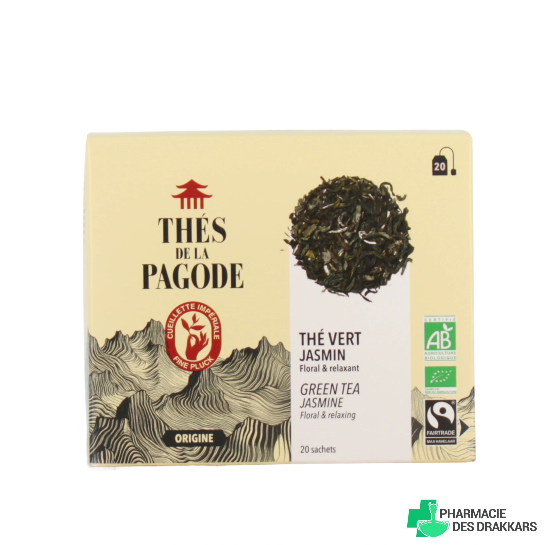 Vous pouvez retrouver le thé vert jasmin des Thés de la Pagode dans la présentation suivante chez la Pharmacie des Drakkars : sachet de 100 g de thé en vrac.