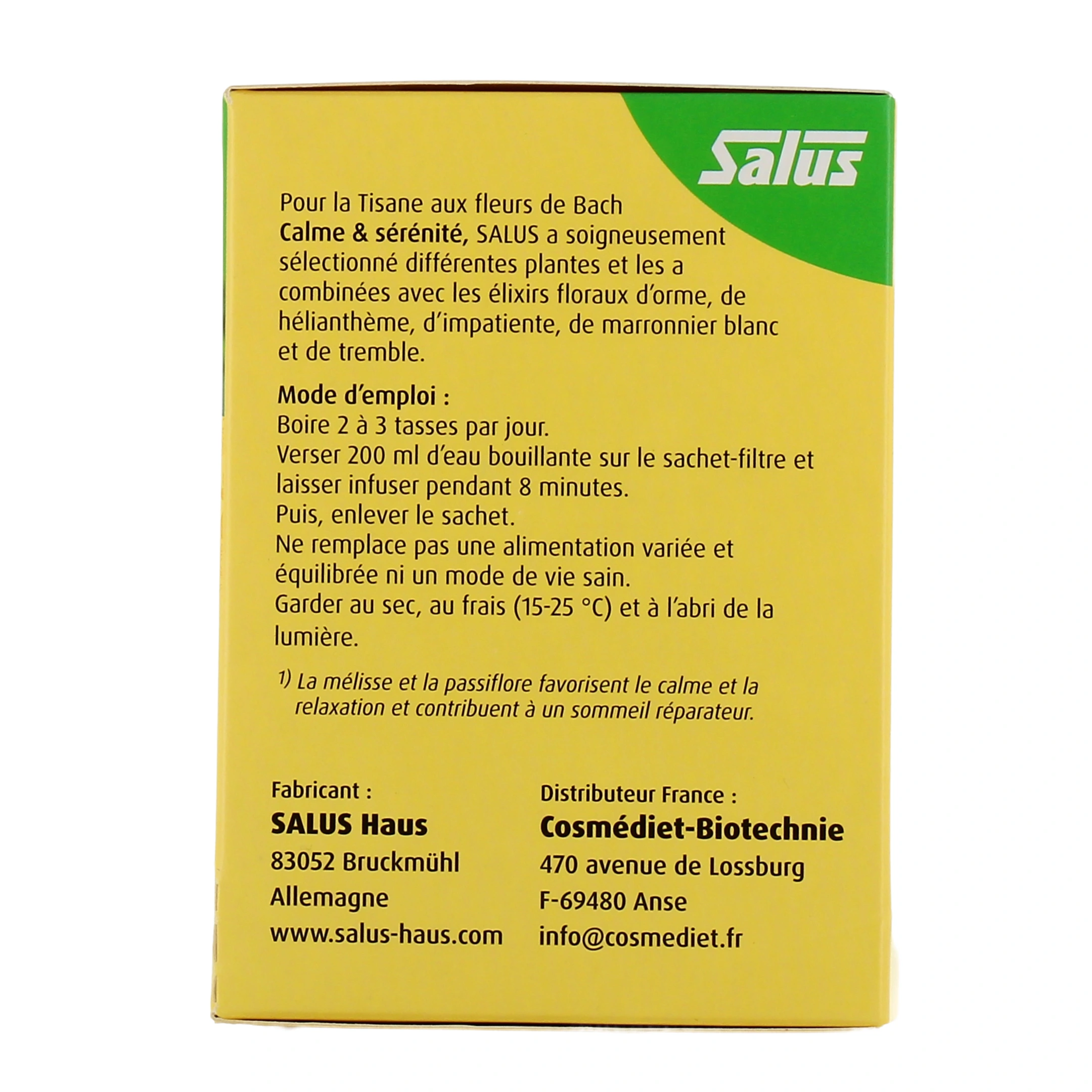 - Tisane Calme & Sérénité : la tisane Calme & Sérénité Salus peut favoriser, lors de journées mentalement épuisantes, davantage de patience et d'équilibre. Les élixirs floraux de Bach sélectionnés pour sa confection sont l'orme, l'hélianthème, l'impatiente, le marronnier blanc et le tremble.