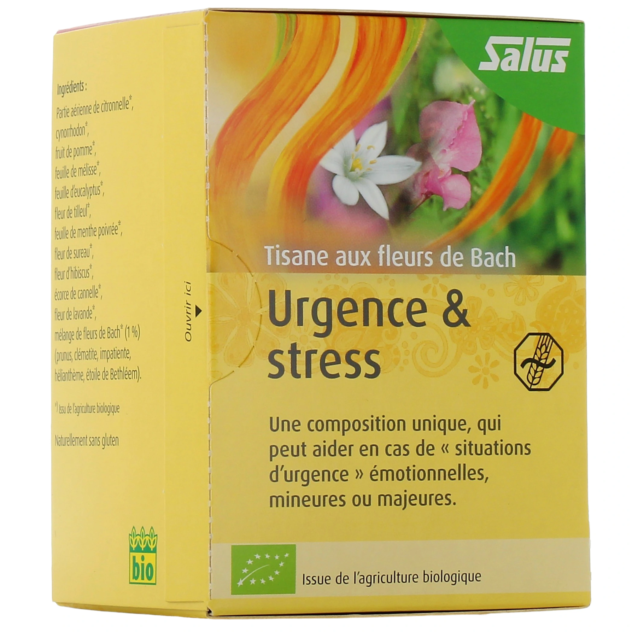 - Tisane Urgence & Stress : composition unique, la tisane Urgence & Stress Salus peut se révéler utile lors des "situations d'urgence" émotionnelles, mineures ou majeures. Elle est composée des élixirs floraux de Bach de prunus, clématite, impatiente, hélanthème et étoile de Bethléem.