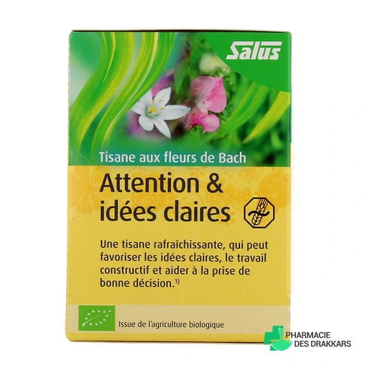 - Tisane Attention & Idées Claires : rafraîchissante, la tisane Attention & Idées Claires Salus soutient les idées claires, le travail constructif et aide à la prise de bonne décision. Elle contient les élixirs floraux de Bach d'avoine sauvage, mimule, bourgeon de marronnier, alène, clématite et impatiente.