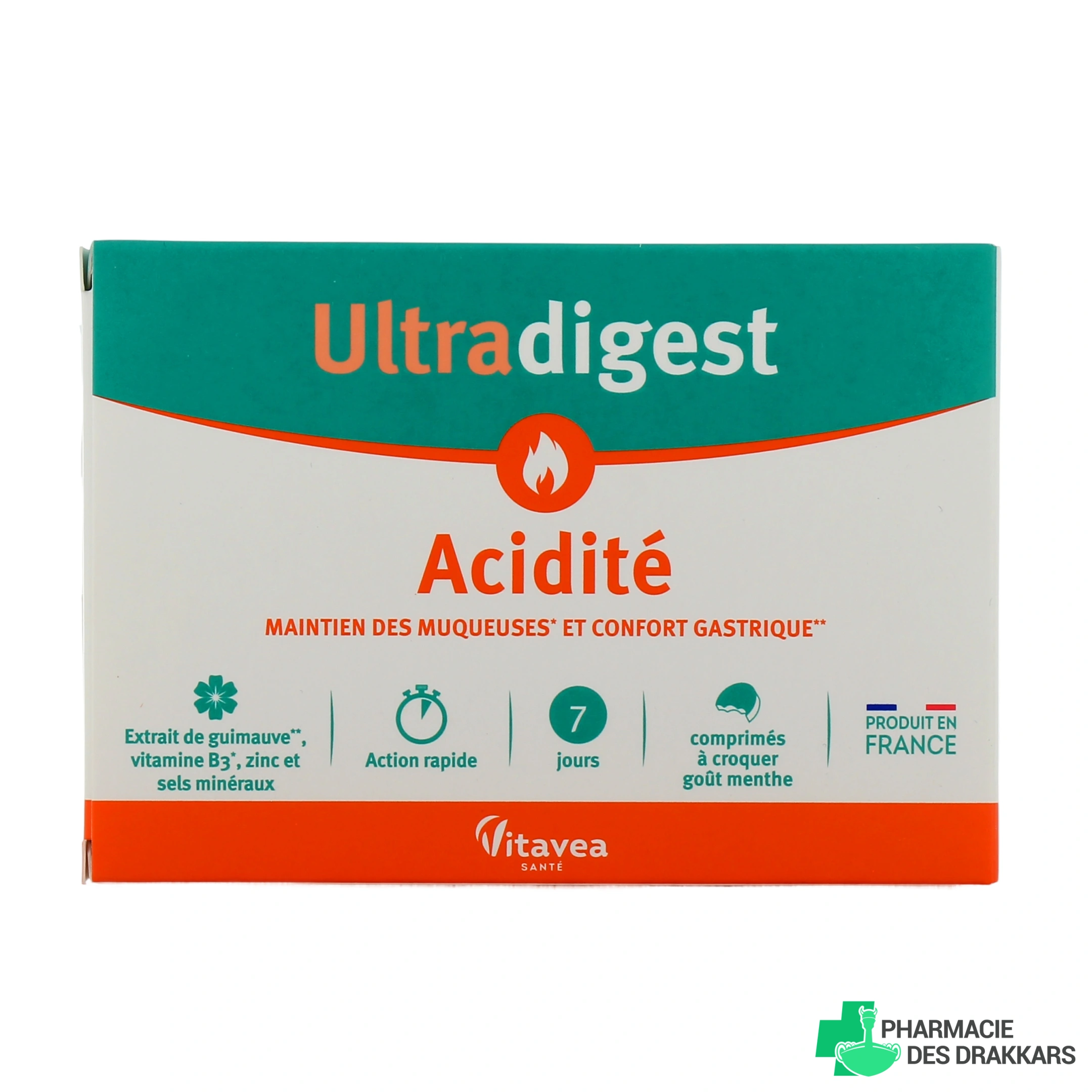 Ultradigest Acidité est un complément alimentaire pour le confort gastrique. Il contient un extrait de guimauve, de la vitamine B3, du zinc et des sels minéraux.