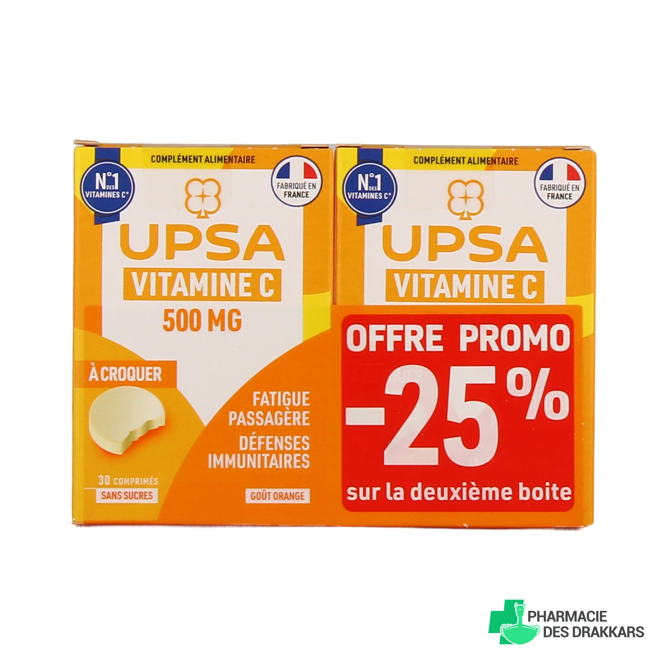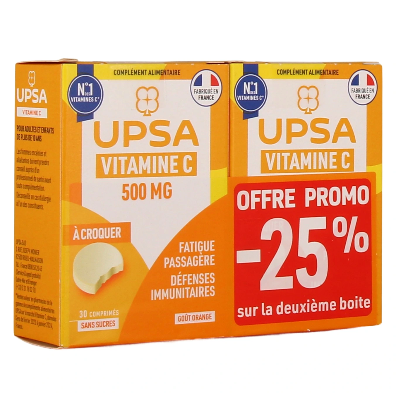 Présentation proposée sur notre pharmacie en ligne pour UPSA Vitalité Vitamine C 500 mg comprimés à croquer : Boîte de 30 comprimés ou lot de 2 boîtes de 30 comprimés.