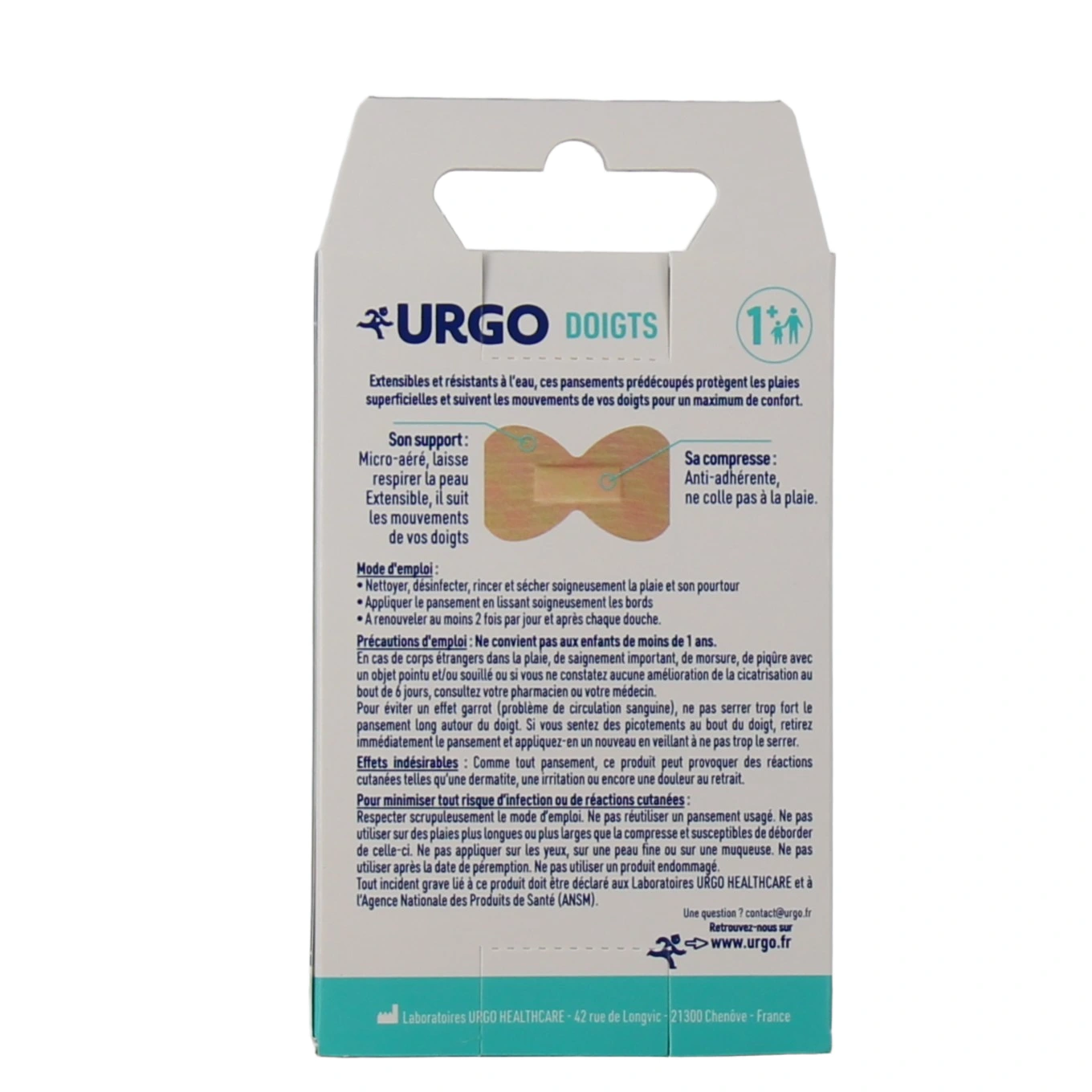 Précautions d'emploi : Ne pas utiliser chez l'enfant de moins de 1 an. En cas de corps étranger dans la plaie, de saignement important, de morsure, de piqûre ou en l'absence d'amélioration dans les 6 jours, consulter un pharmacien ou un médecin. Ce produit peut provoquer des réactions cutanées telles qu'une dermatite, une irritation ou encore une douleur au retrait. Respecter le mode d'emploi. Ne pas réutiliser un pansement usagé. Ne pas utiliser sur des plaies plus larges ou plus longues que la compresse et susceptibles de déborder de celle-ci. Ne pas appliquer sur les yeux, sur une peau fine ainsi que sur les muqueuses. Ne pas utiliser après la date de péremption. Ne pas utiliser si le produit est endommagé. Boîte plastique à recycler. Pansement à usage unique.
