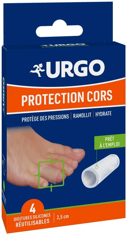 Conditionnement disponible sur votre pharmacie en ligne pour Urgo Protection Cors : boîte de 4 digitubes de 2,5 cm prêts à l'emploi.