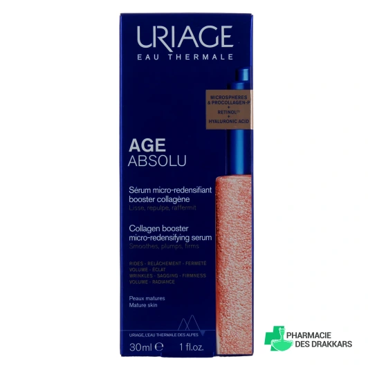 Présentation proposée par notre pharmacie en ligne pour le sérum micro-redensifiant booster collagène âge absolu Uriage : flacon de 30 ml.