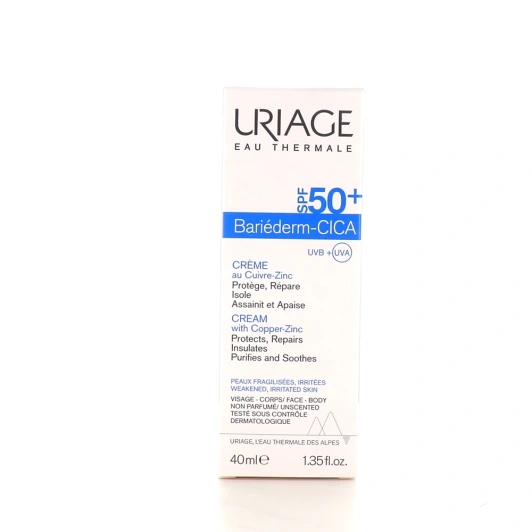 Présentation proposée par votre pharmacien en ligne pour la crème au cuivre-zinc Uriage Bariéderm-Cica SPF50+ : Tube de 40 ml.