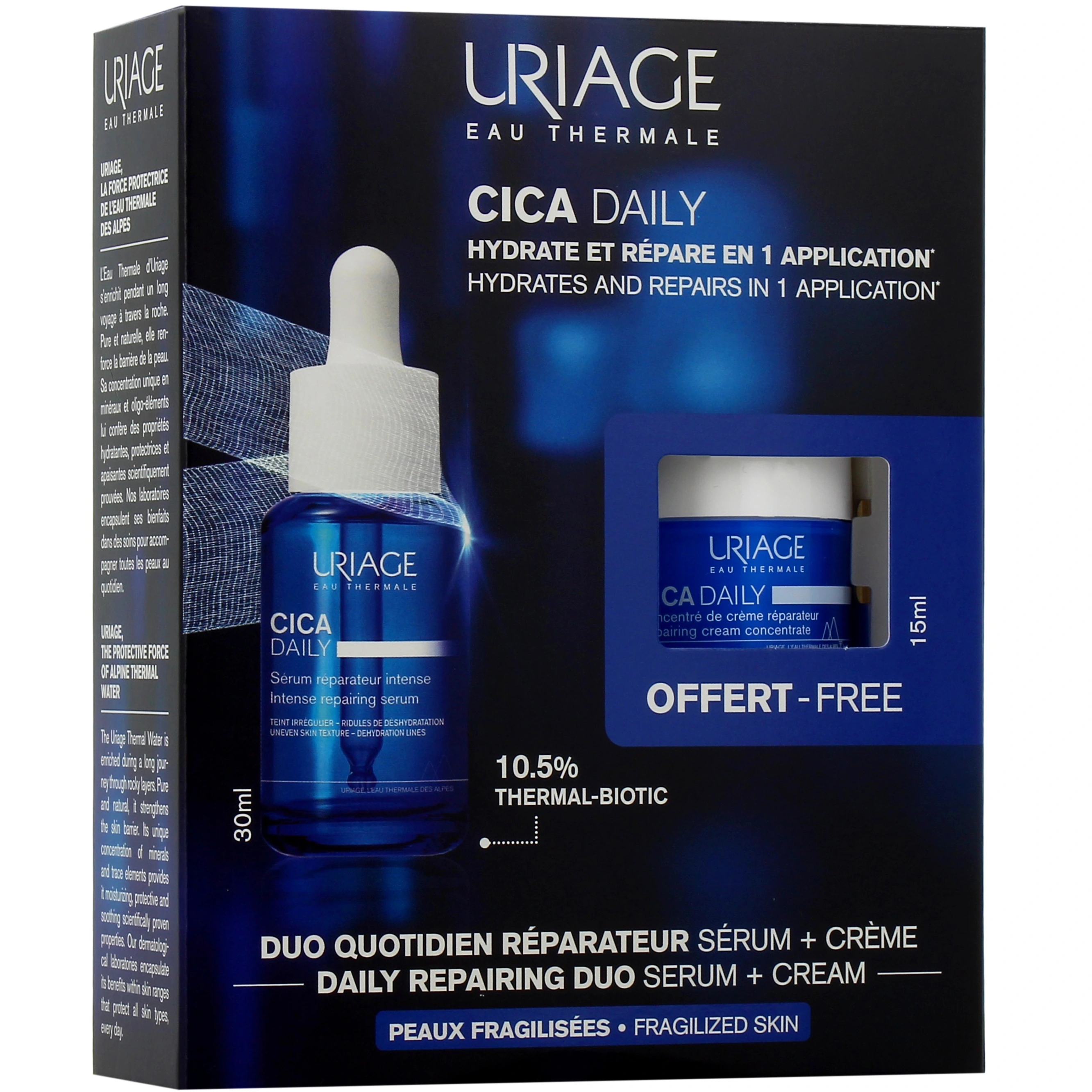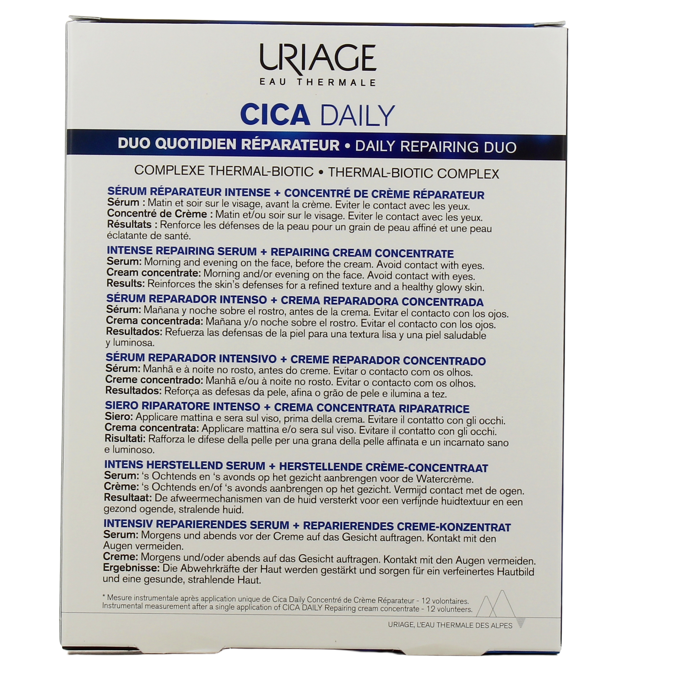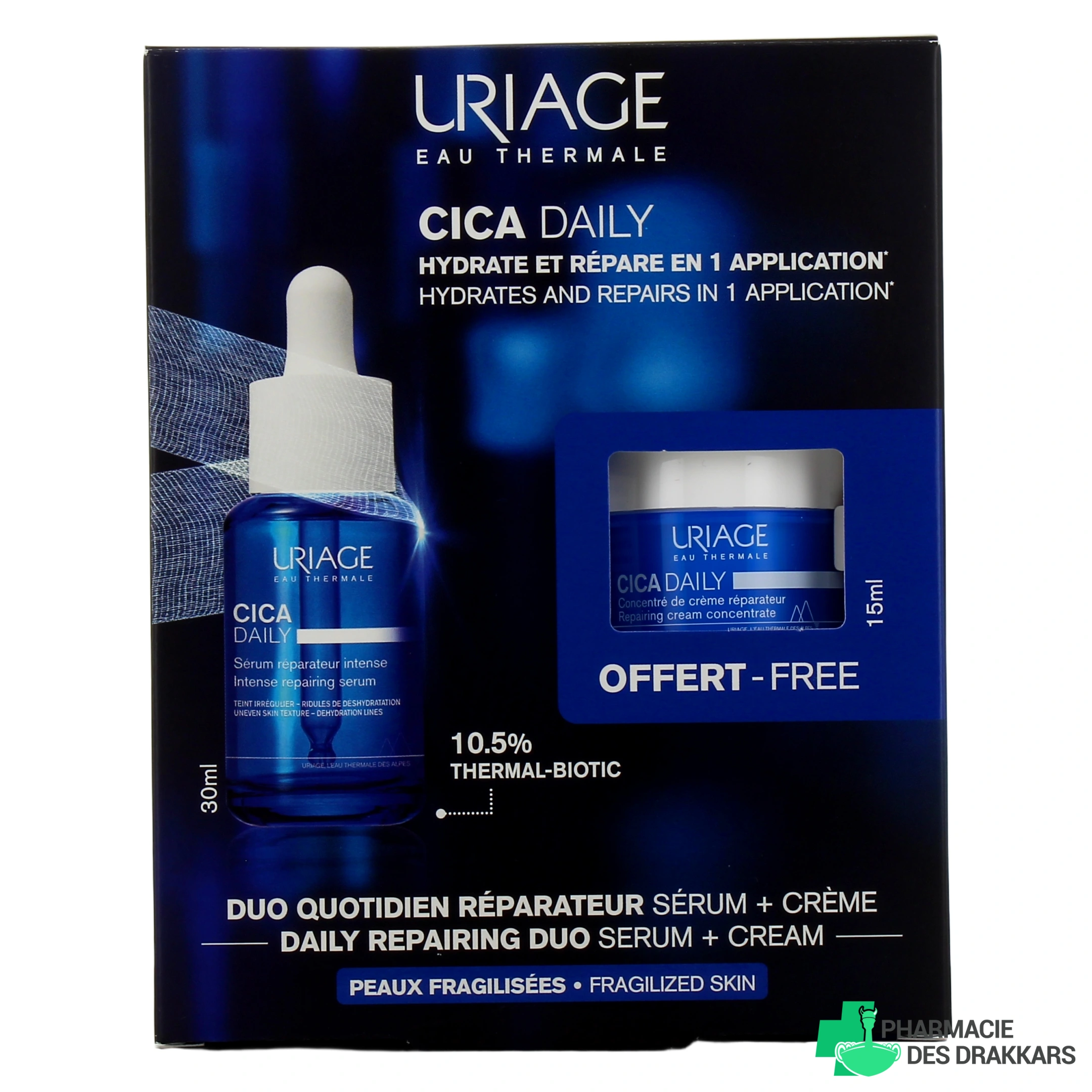 Uriage a donc mis au point le sérum Bariéderm Cica Daily pour répondre aux besoins de ces peaux fragilisées. L'eau thermale d'Uriage associée à l'Inuline (un prébiotique) permettent de rééquilibrer la barrière cutanée. Capable de retenir jusqu'à 1000 fois son poids en eau, l'acide hyaluronique contenu dans ce sérum prévient le dessèchement cutané et lisse les rides localisées à la surface de la peau. La plante Centella Asiatica aux vertus apaisantes, réparatrices et régénérantes, associée à l'acide hyaluronique, renforce l'élasticité de la peau. Enfin, la vitamine B5 agit en faveur de la réparation cutanée grâce à son action adoucissante et apaisante. La peau se répare alors plus rapidement pour éviter que les signes de l'âge ne s'installent.
