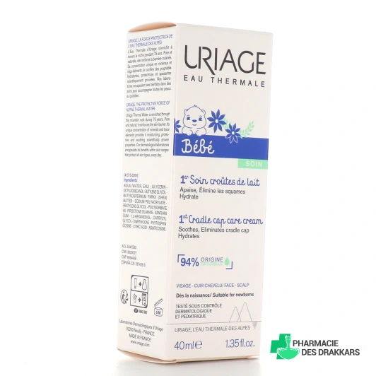 Formulé à 94% d'ingrédients d'origine naturelle, le soin croûtes de lait Uriage Bébé est une crème régulatrice et apaisante adapté au visage et cuir chevelu des tout petits qui présentent des croûtes de lait.