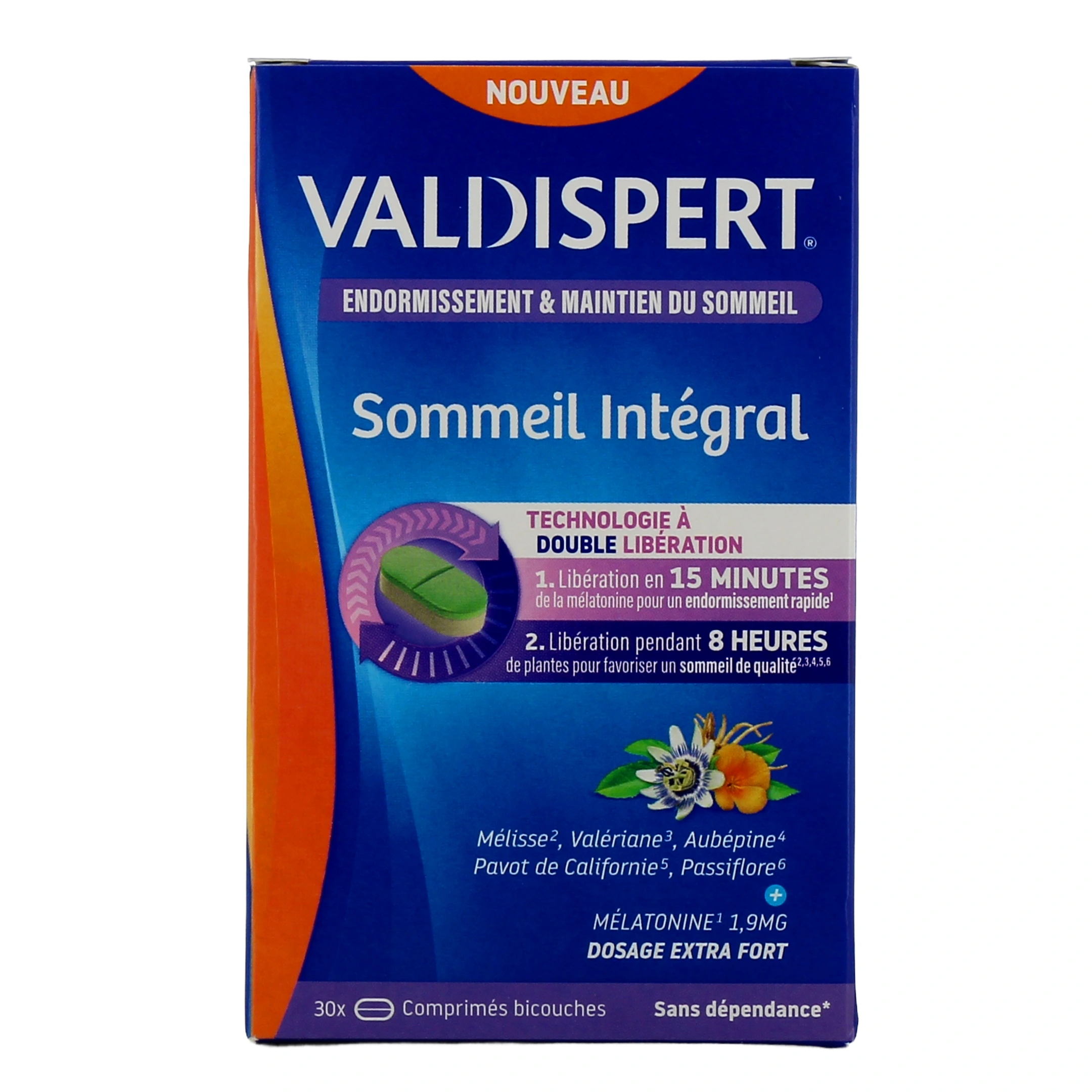 Présentation proposée pour Valdispert Sommeil Intégral sur notre pharmacie en ligne : Boîte de 30 ou de 10 comprimés bicouches