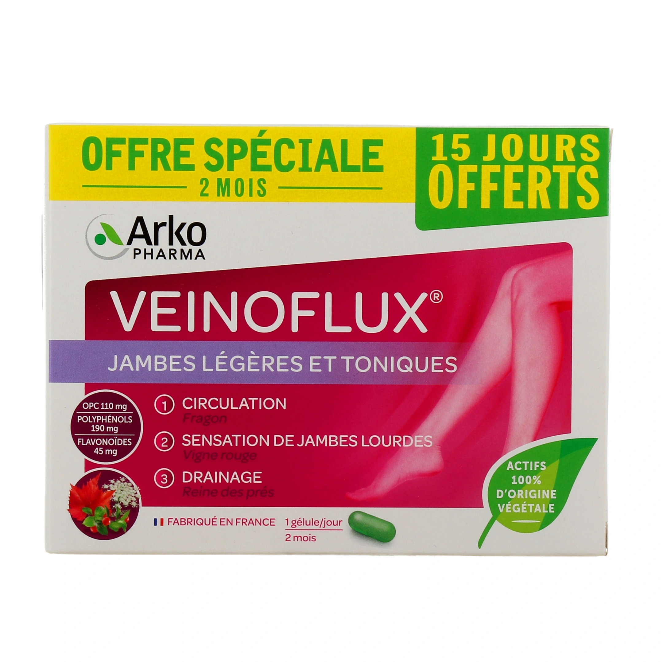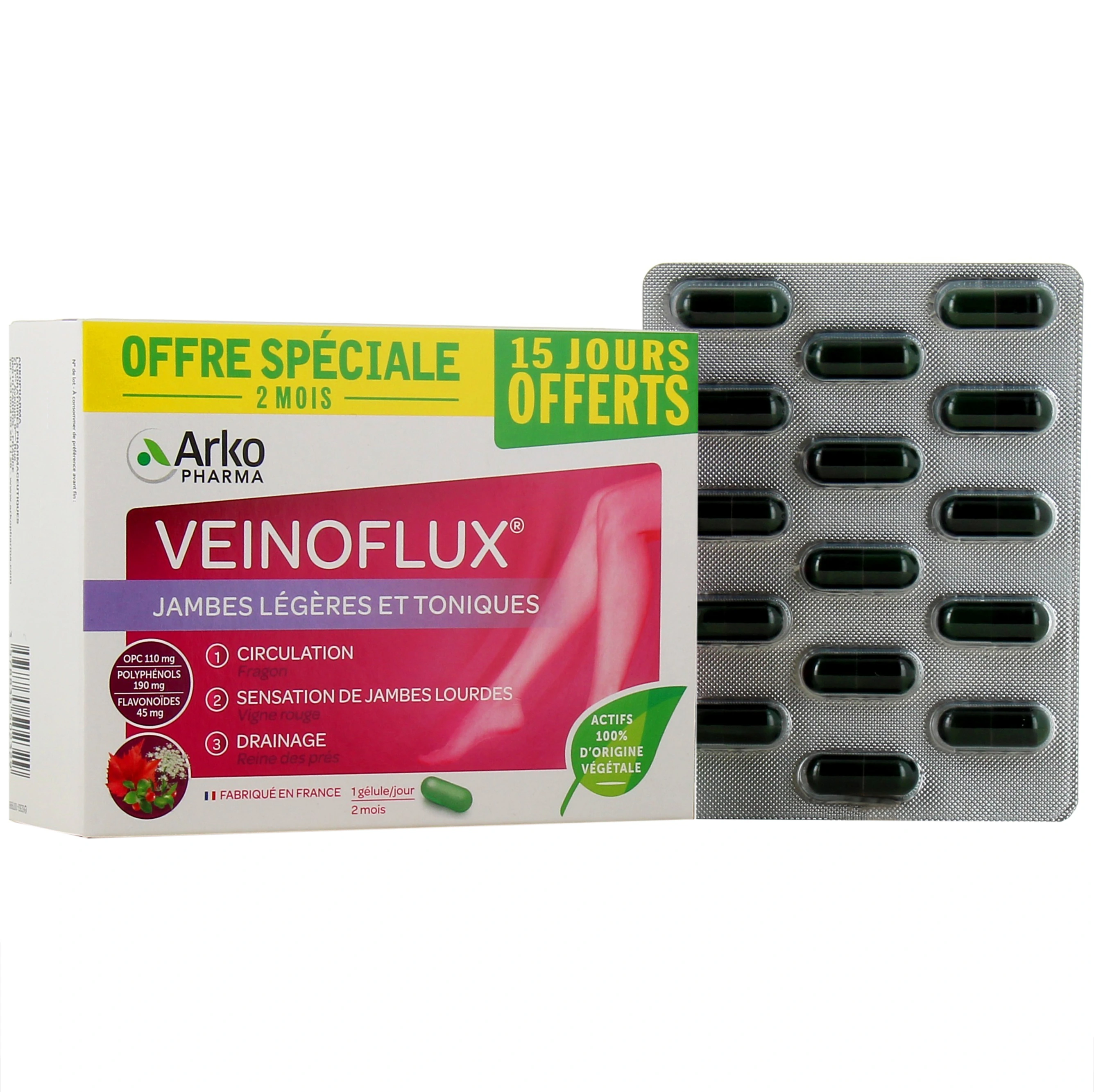 Les présentations proposées par votre pharmacie en ligne : boîte de 30 gélules (programme de 1 mois), ou 60 gélules (Offre spéciale 2 mois, 15 jours offerts, sous réserve de disponibilité). Également disponible avec gel Veinoflux effet (format 15 ml).