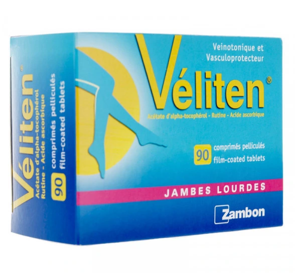 Veliten est un médicament à base d'acide ascorbique (vitamine C), d'alpha-tocophérol acétate (vitamine E) et de rutoside. Ce médicament pour jambes lourdes est un protecteur vasculaire et un tonique veineux qui permet de stimuler la circulation sanguine dans les veines et de lutter contre l'altération des vaisseaux capillaires.