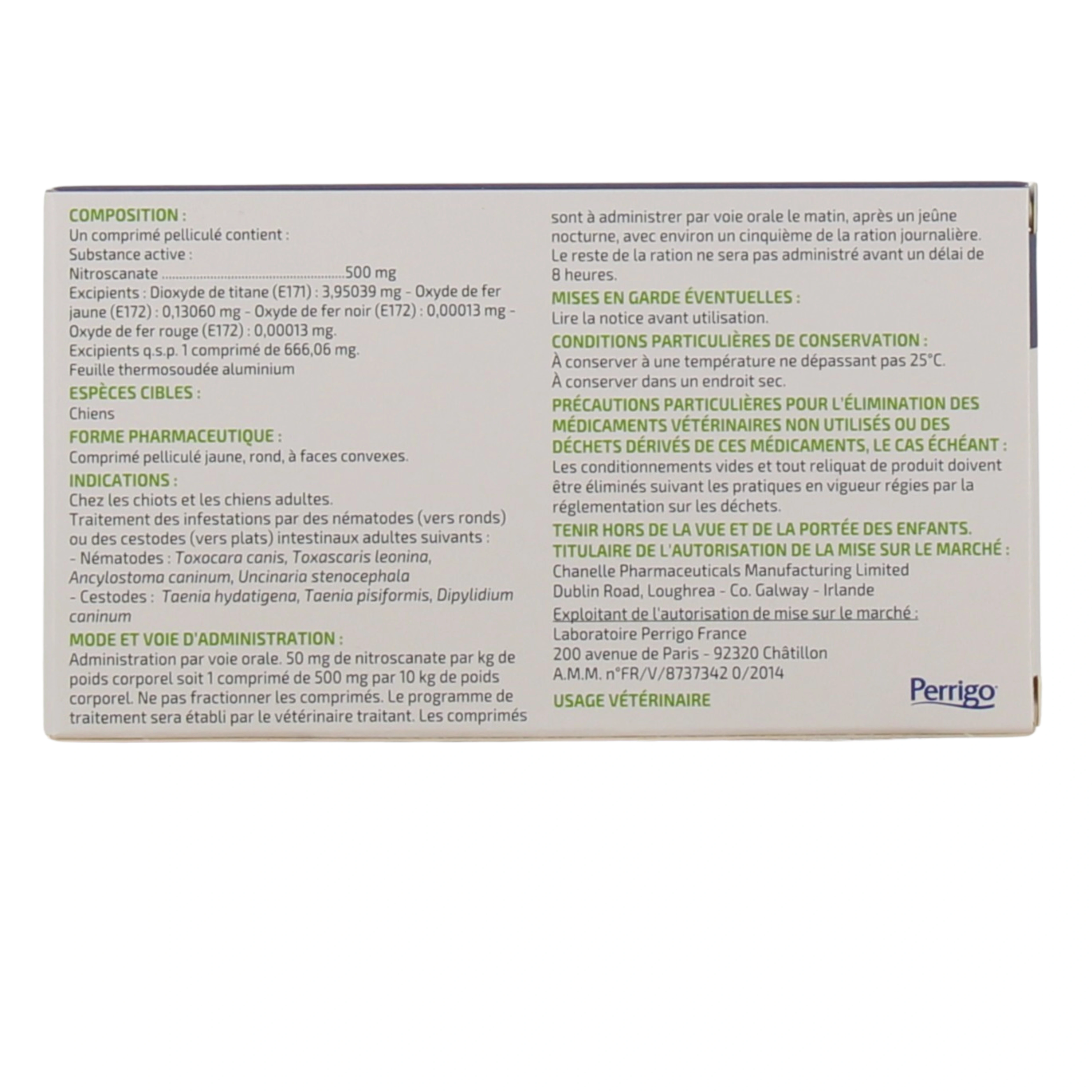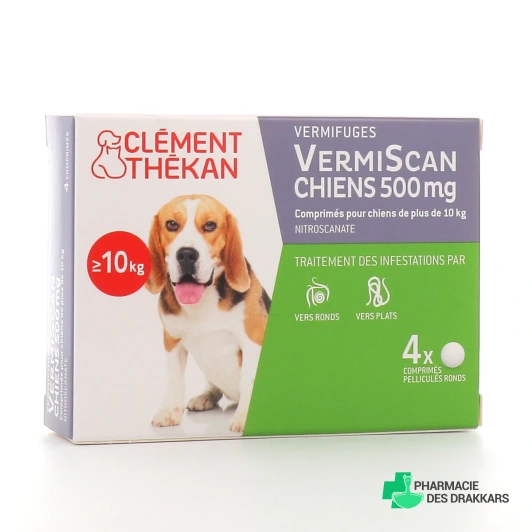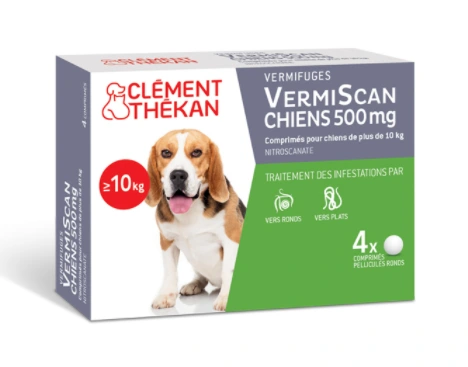 Pour traiter son chien contre les vers, le vermifuge VermiScan de Clément Thékan est un médicament vétérinaire à base de Nitroscanate, pour le traitement des infestations par les vers ronds et les vers plats.
