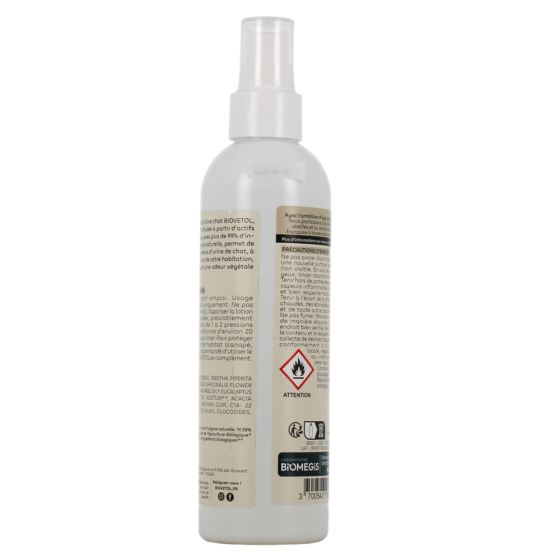 Biovetol Lotion Destruct'Urine Chat Bio est un spray qui permet de lutter contre les odeurs d'urine des chats et chatons. Grâce à son action olfactive, cette lotion prévient le risque de récidive.