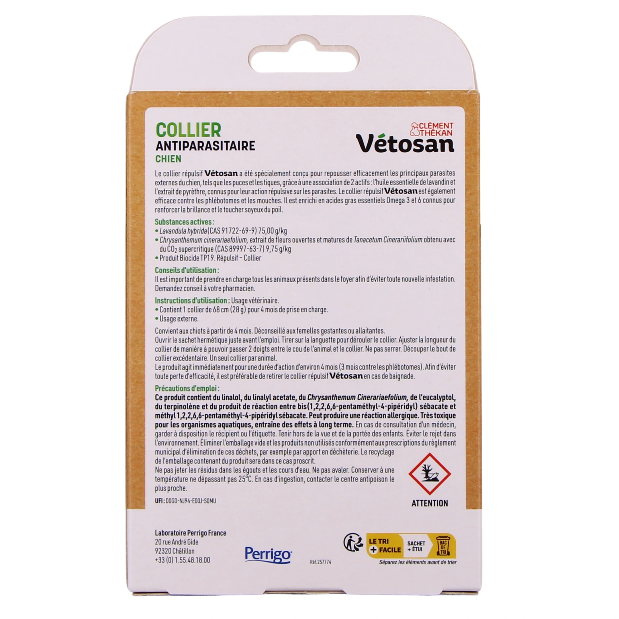 Le collier répulsif Vétosan a été spécialement conçu pour repousser efficacement les principaux parasites extrernes du chien et du chat, tels que les puces et les tiques, grâce à une association de 2 actifs d'origine végétale : l'huile essentielle de lavadin et l'extrait de pyrèthre, connus pour leur action répulsive sur les parasites. Le collier répulsif Vétosan est également efficace contre les phlébotomes et les mouches. Ce collier pour chat ou chien est également enrichi en acides gras essentiels Omega 3 et 6 connus pour renforcer la brillance et le toucher soyeux du poil.