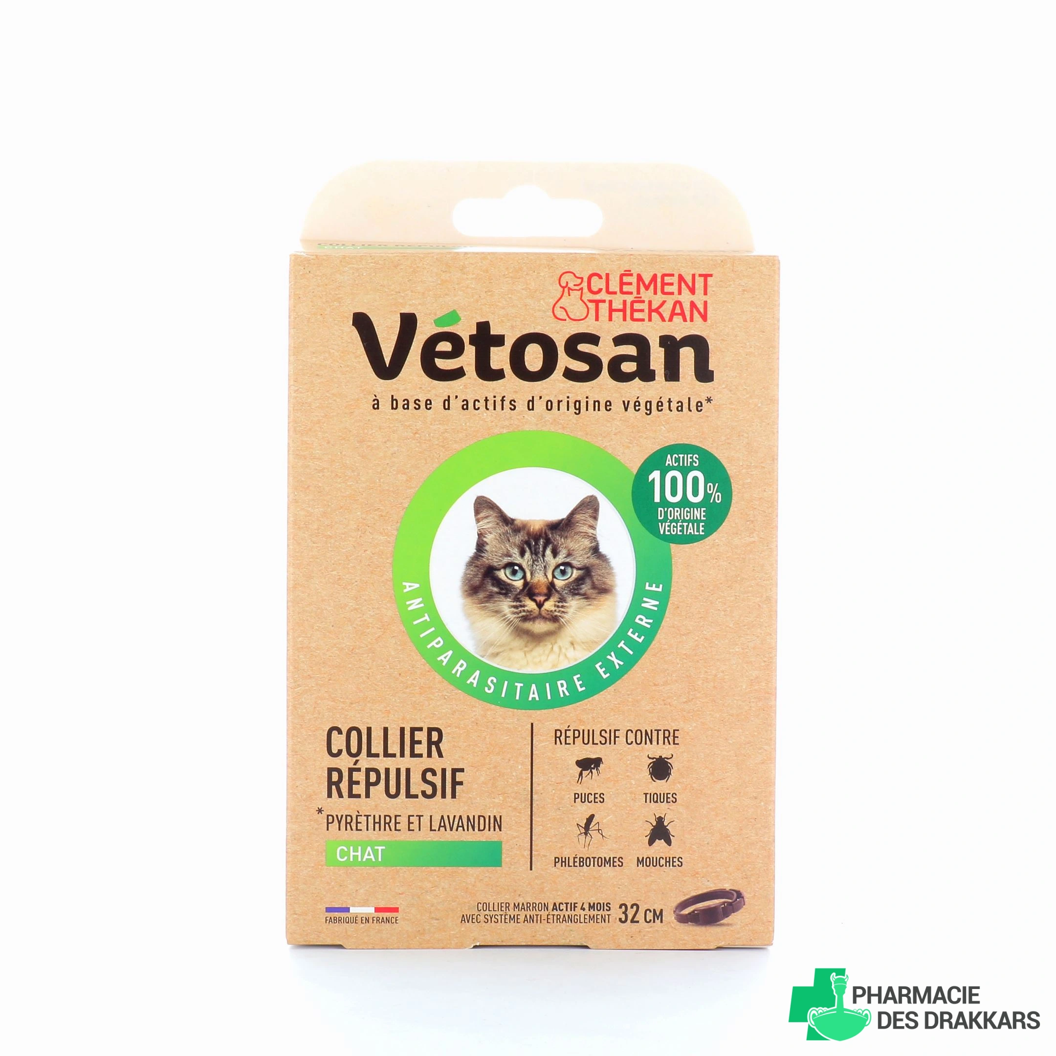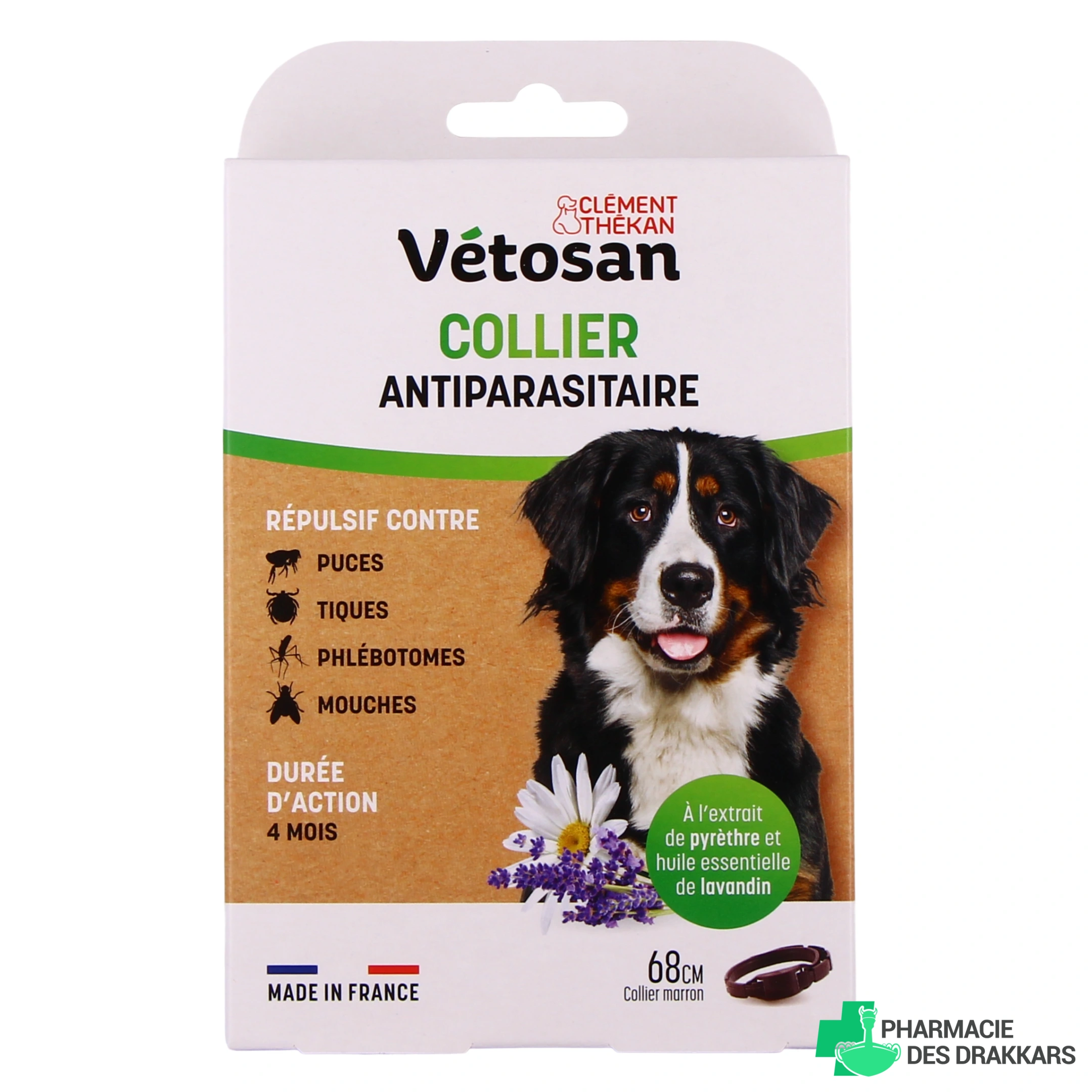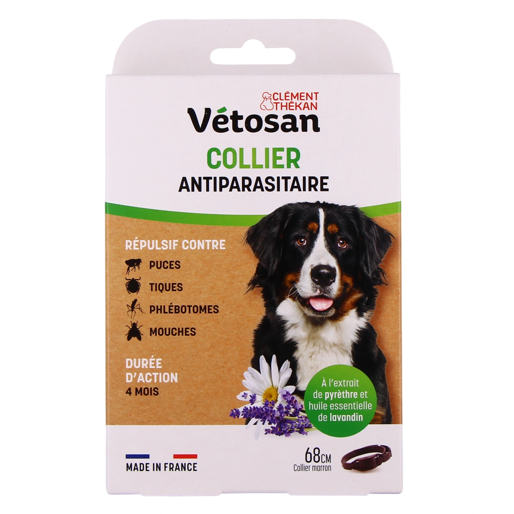 ¨Protégez naturellement votre compagnon des tiques, des puces, des phlébotomes et des mouches grâce au collier répulsif Vétosan. Votre chat ou votre chien sera ainsi préservé de l'attaque de ces parasites pour une durée de 4 mois.