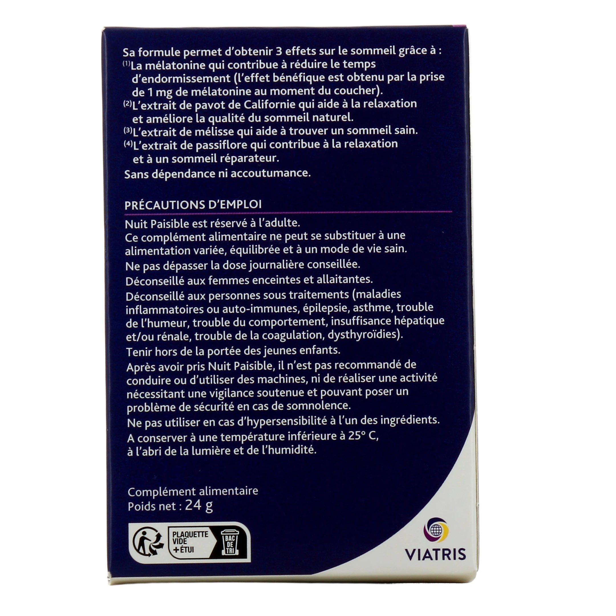 Viatris Nuit Paisible est un complément alimentaire réservé à l'adulte. Il est indiqué de prendre 1 comprimé par jour avec un verre d'eau eu moment du coucher, en programme ponctuel de 15 ou de 30 jours.