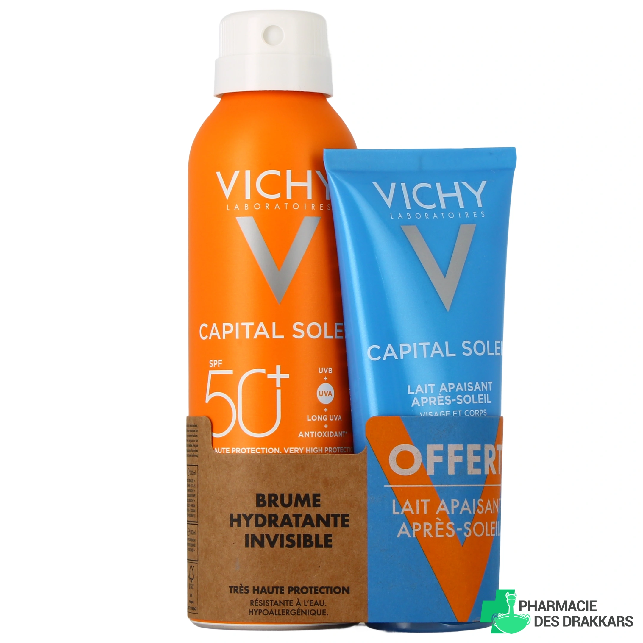 Présentation proposée pour la brume solaire hydratante SPF 50 Vichy Capital Soleil sur notre pharmacie en ligne : Spray de 200 ml