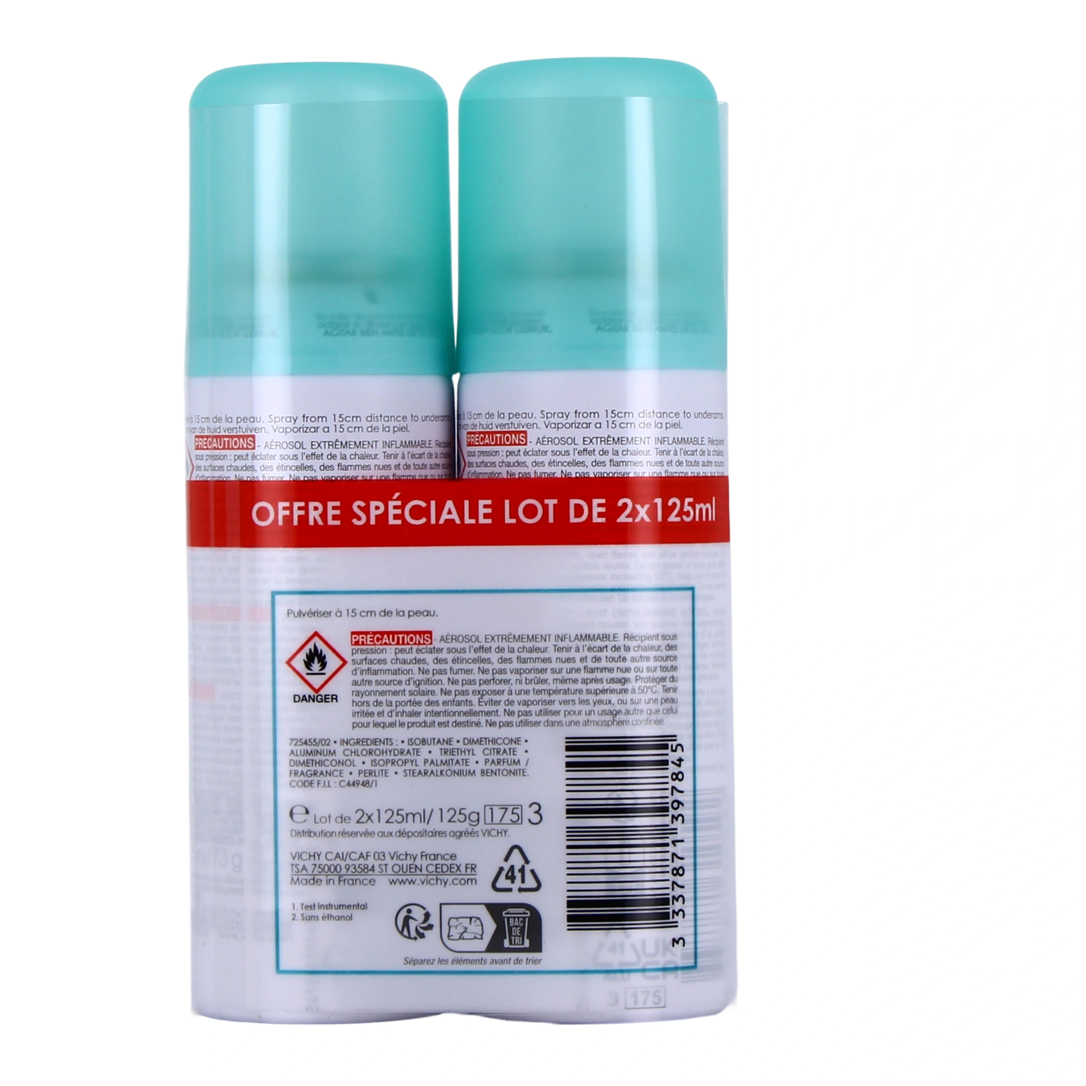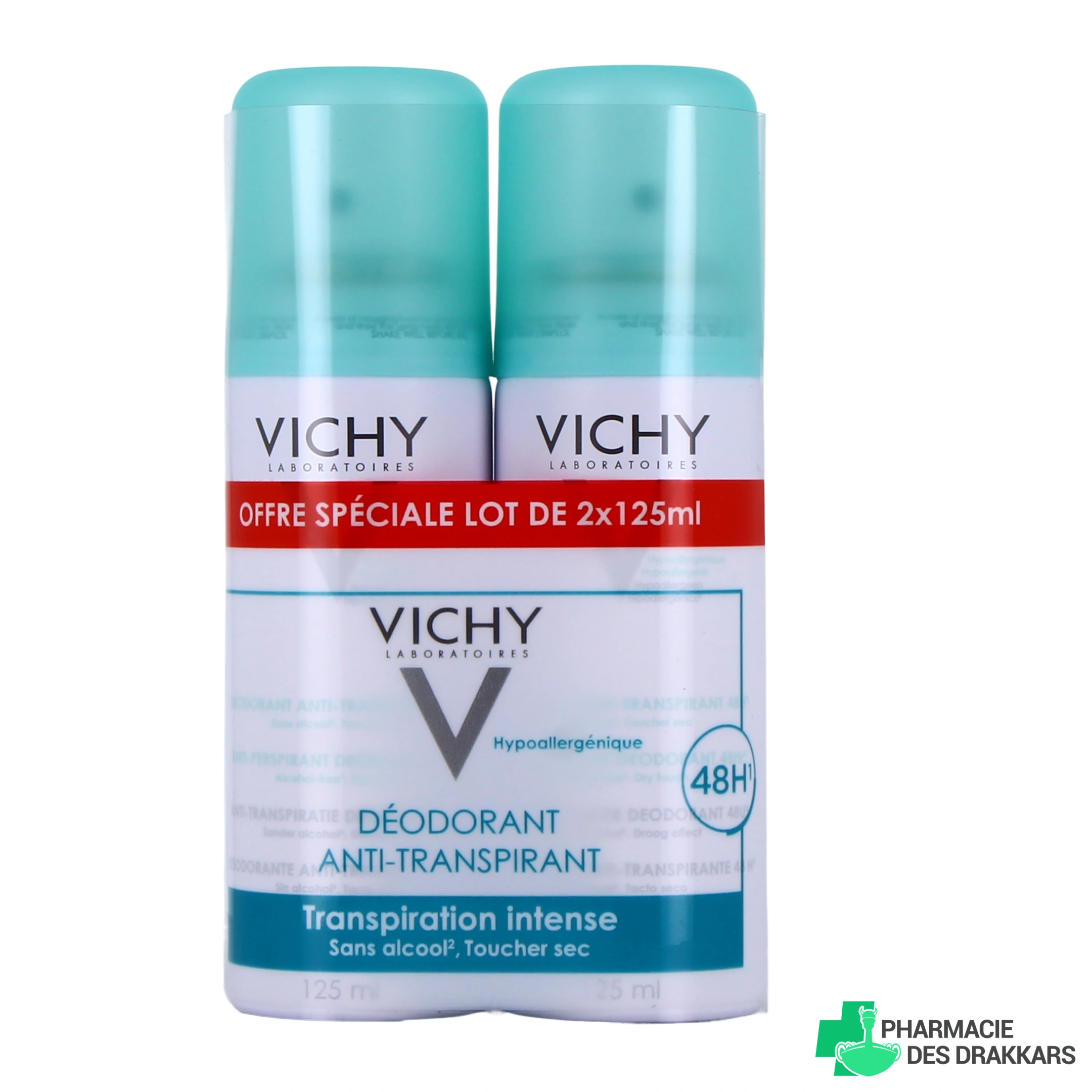 Présentations proposées par votre pharmacie en ligne : Vichy Déodorant Aérosol Anti-Transpirant 48h Spray de 125ml ; Lot de 2 sprays de 125ml.