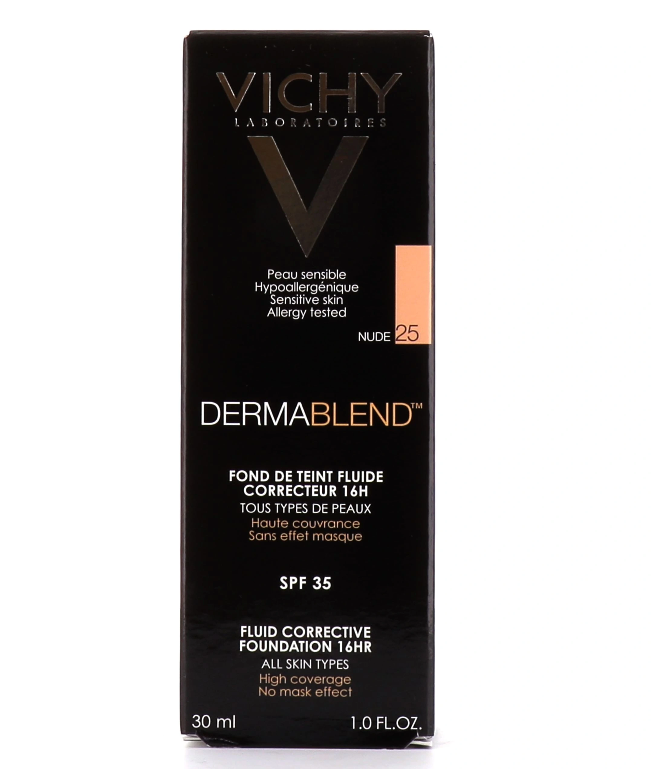 Le plus du fond de teint fluide correcteur 16h Vichy Dermablend : Capable de se fluidifier avec la chaleur de la peau, sa texture crée une très fine couche, sans marquer les rides ni laisser de film gras. Le teint est totalement unifié avec un fini peau nue naturel.