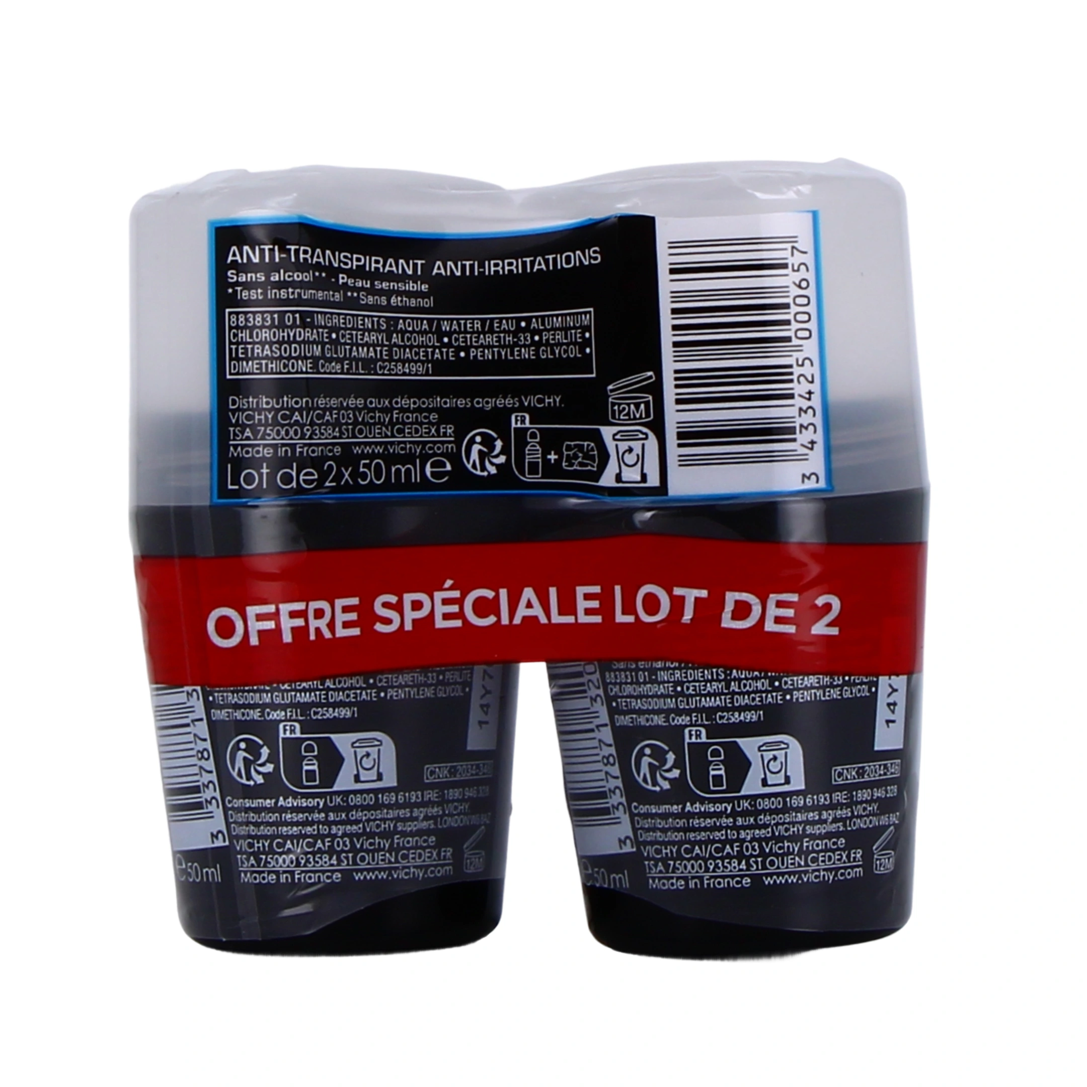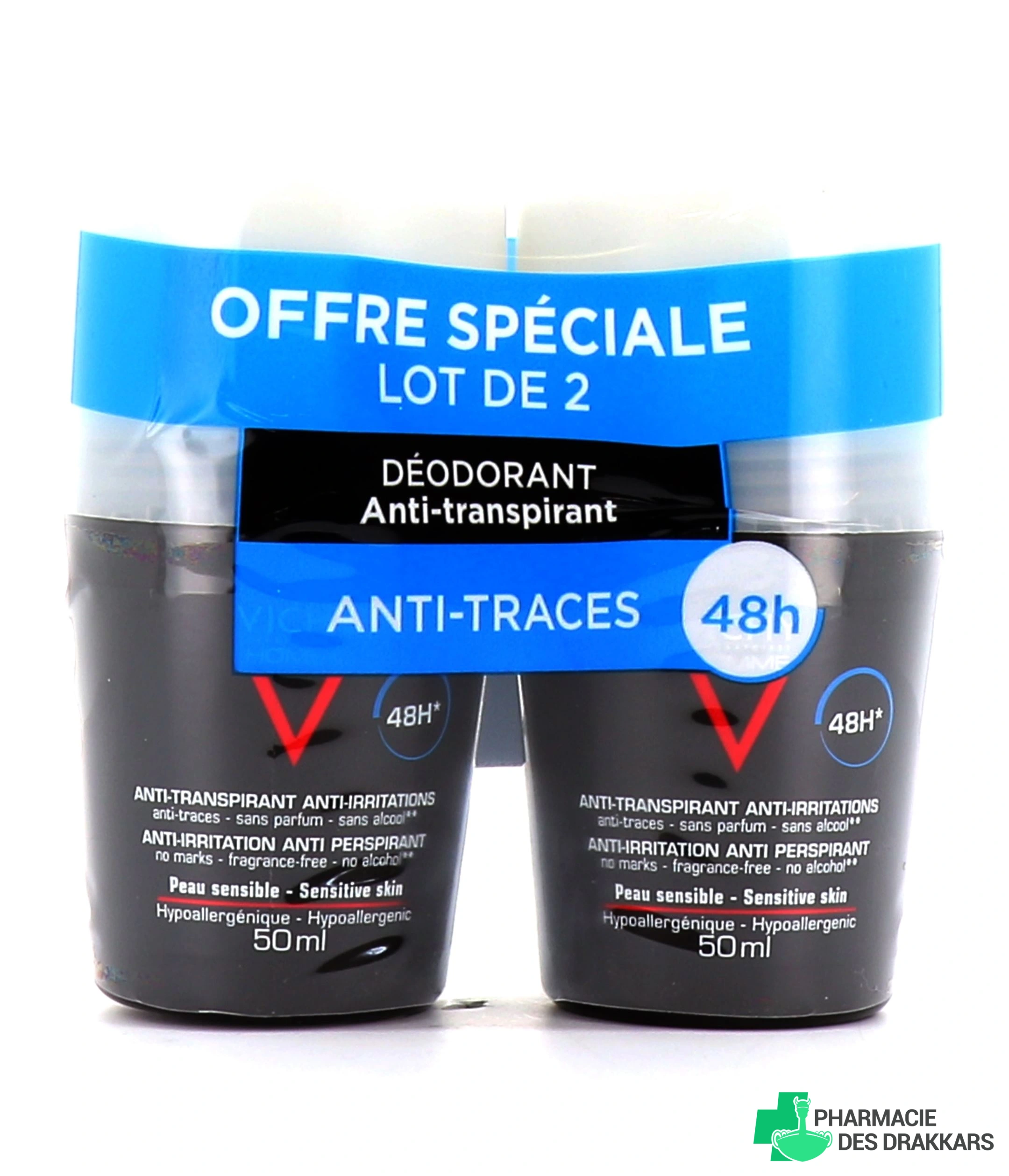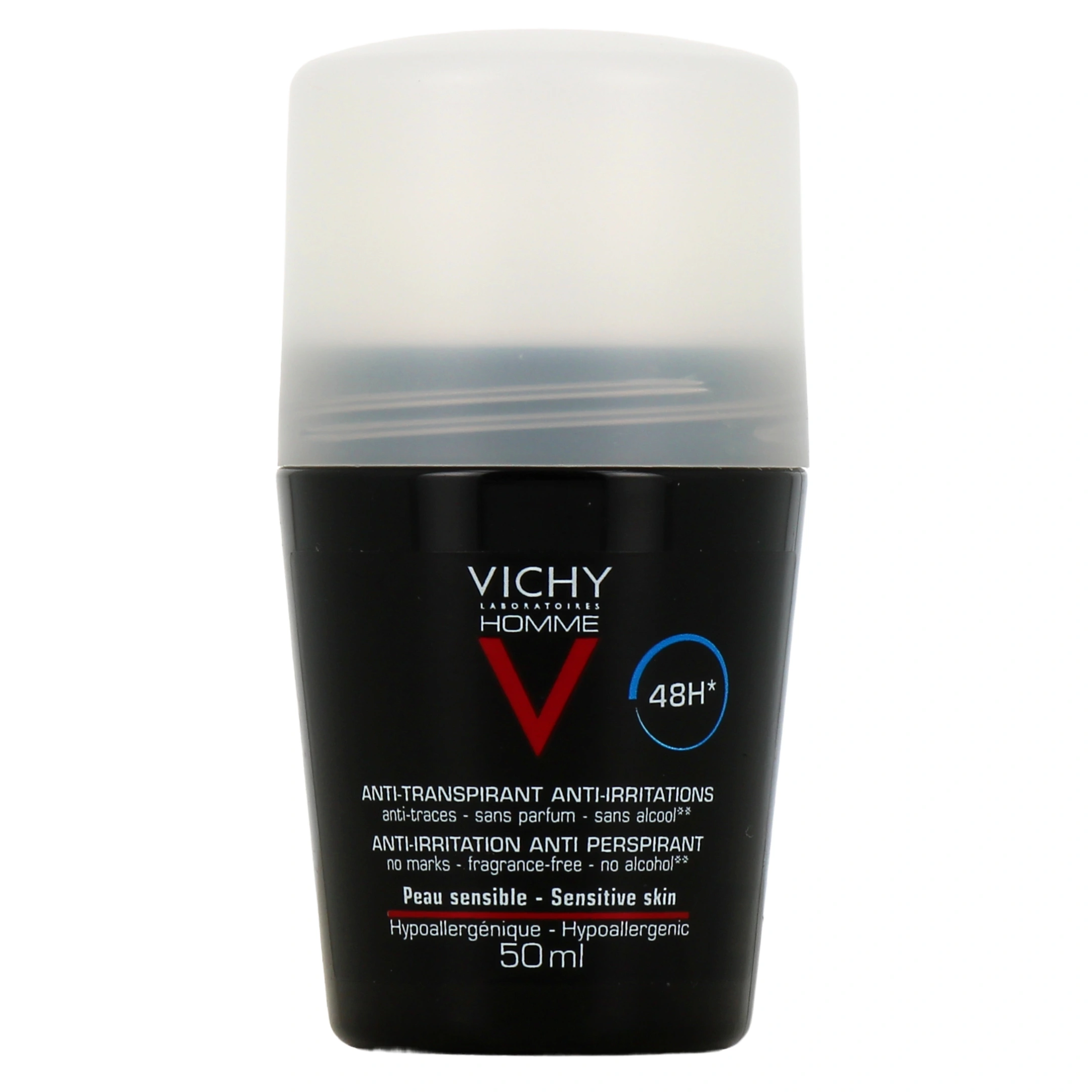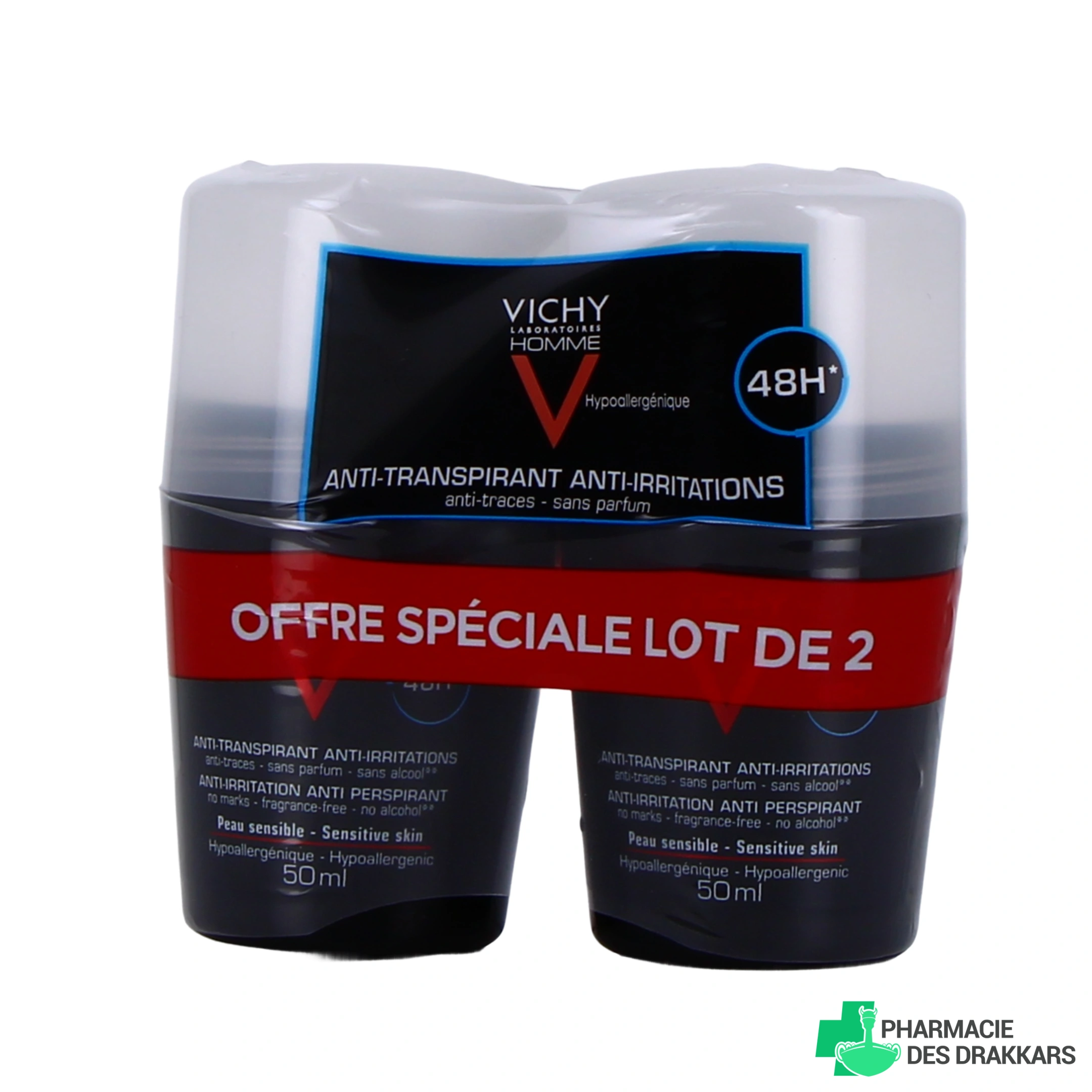 Présentations proposées par votre pharmacie en ligne : Vichy Homme Déodorant Anti-transpirant 48H Peaux sensibles Roll-on de 50ml ; Lot de 2 rolls-on de 50ml.