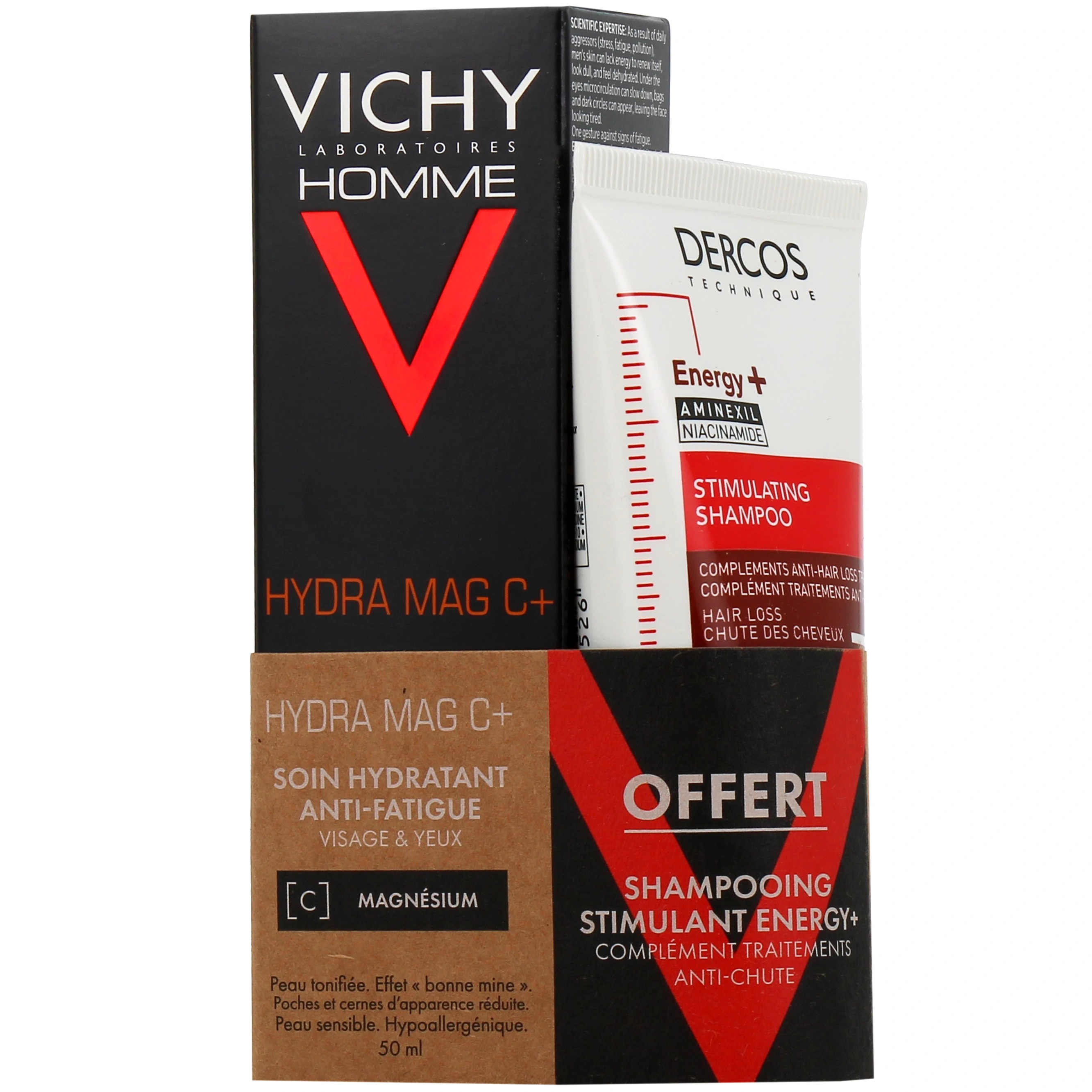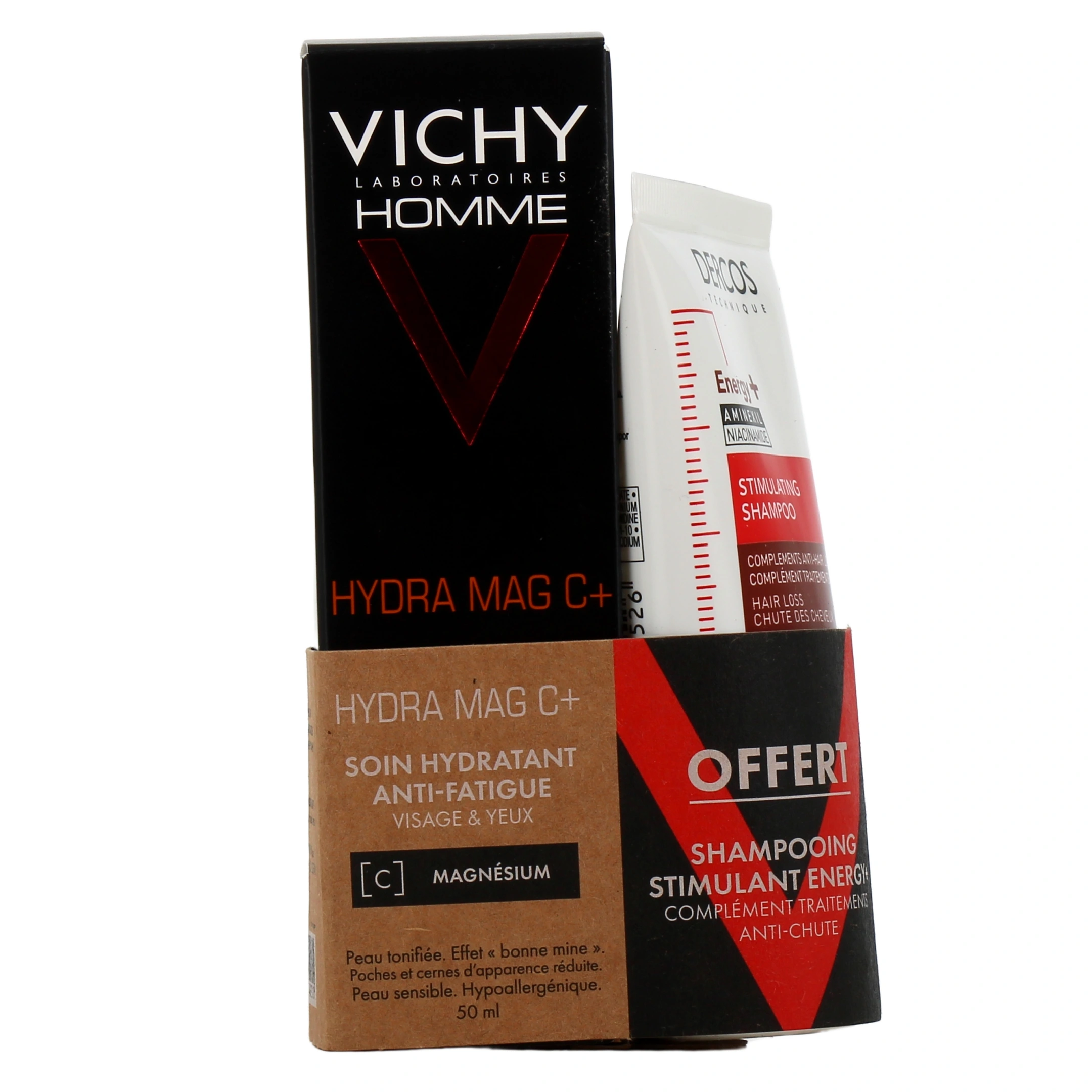 Présentations proposées par votre pharmacie en ligne : Vichy Homme Hydra Mag C+ Soin hydratant Anti-fatigue Tube de 50ml ; Offre duo.