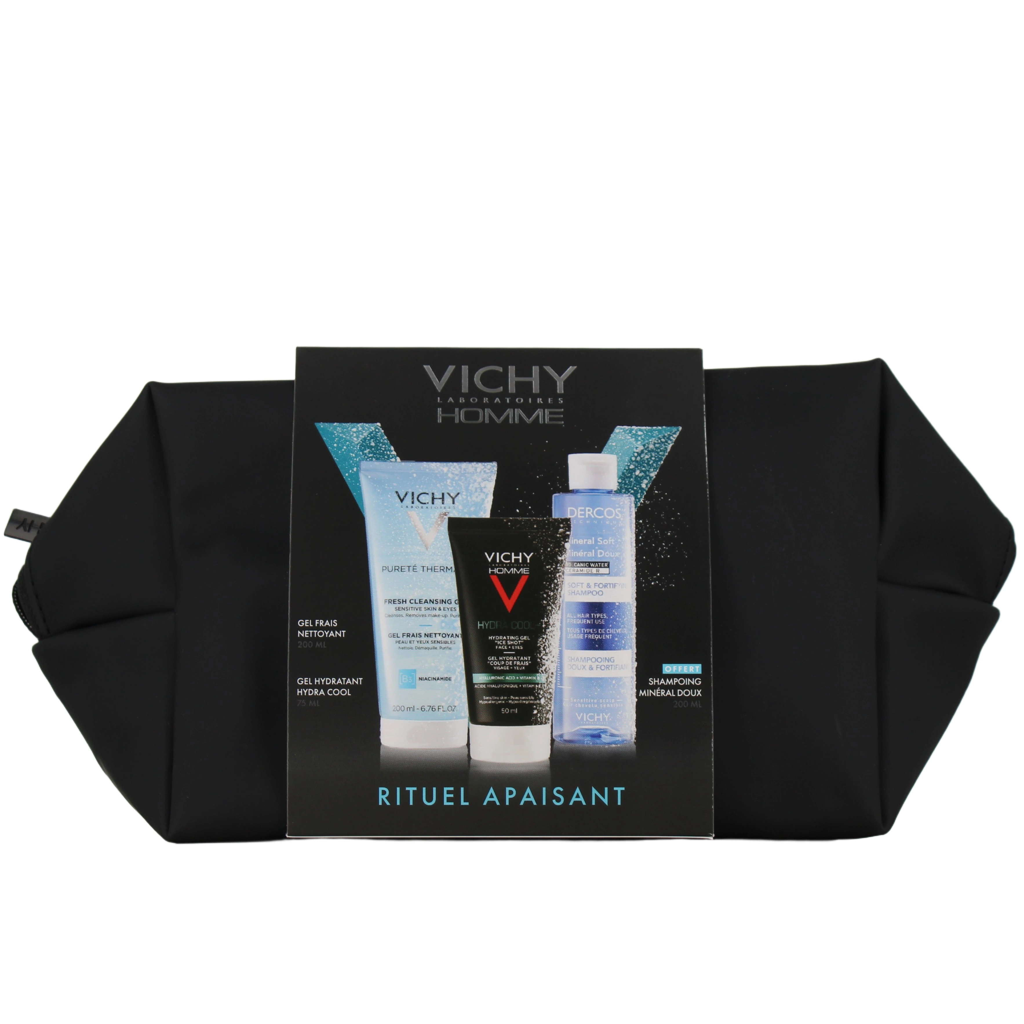 Idéale pour les hommes appréciant prendre soin de leur peau, le rituel apaisant Vichy se présente sous la forme d'une trousse renfermant 2 soins Vichy pour le visage ainsi qu'un shampoing Dercos pour compléter la routine.