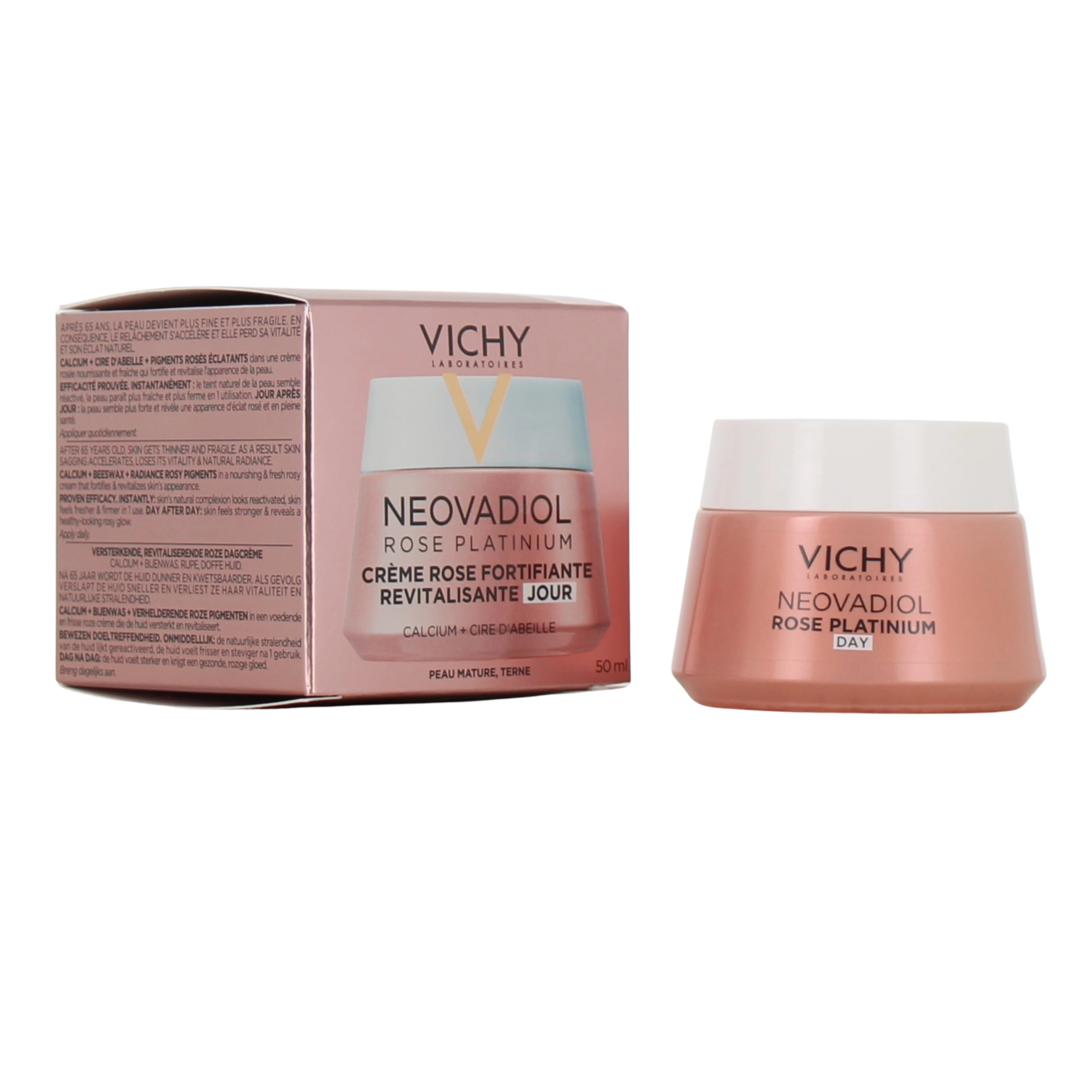 Présentations proposées par votre pharmacie en ligne pour la crème de jour Vichy Neovadiol Rose Platinium : Pot de 50ml ; Coffret comprenant la crème en 50ml + la crème de nuit Rose Platinium 15ml OFFERTE.