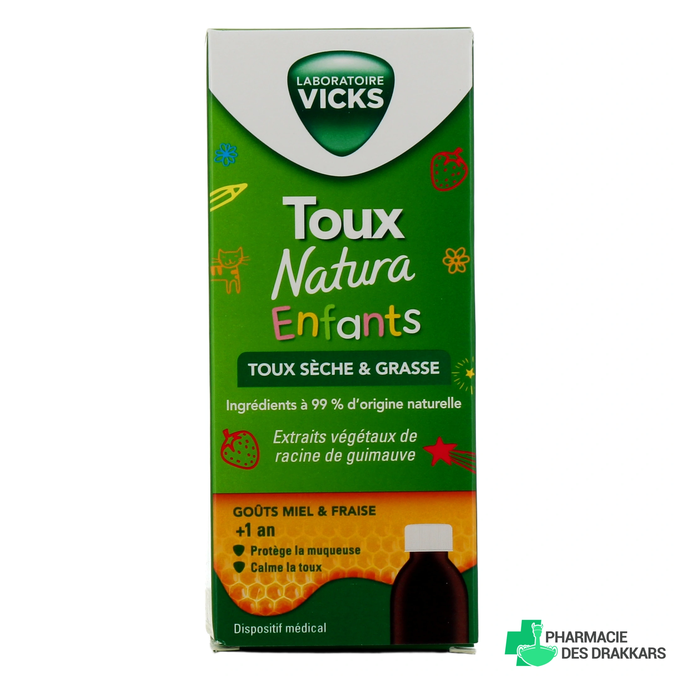 - Vicks Toux Natura Sirop Enfants goûts miel et fraise 140 ml.