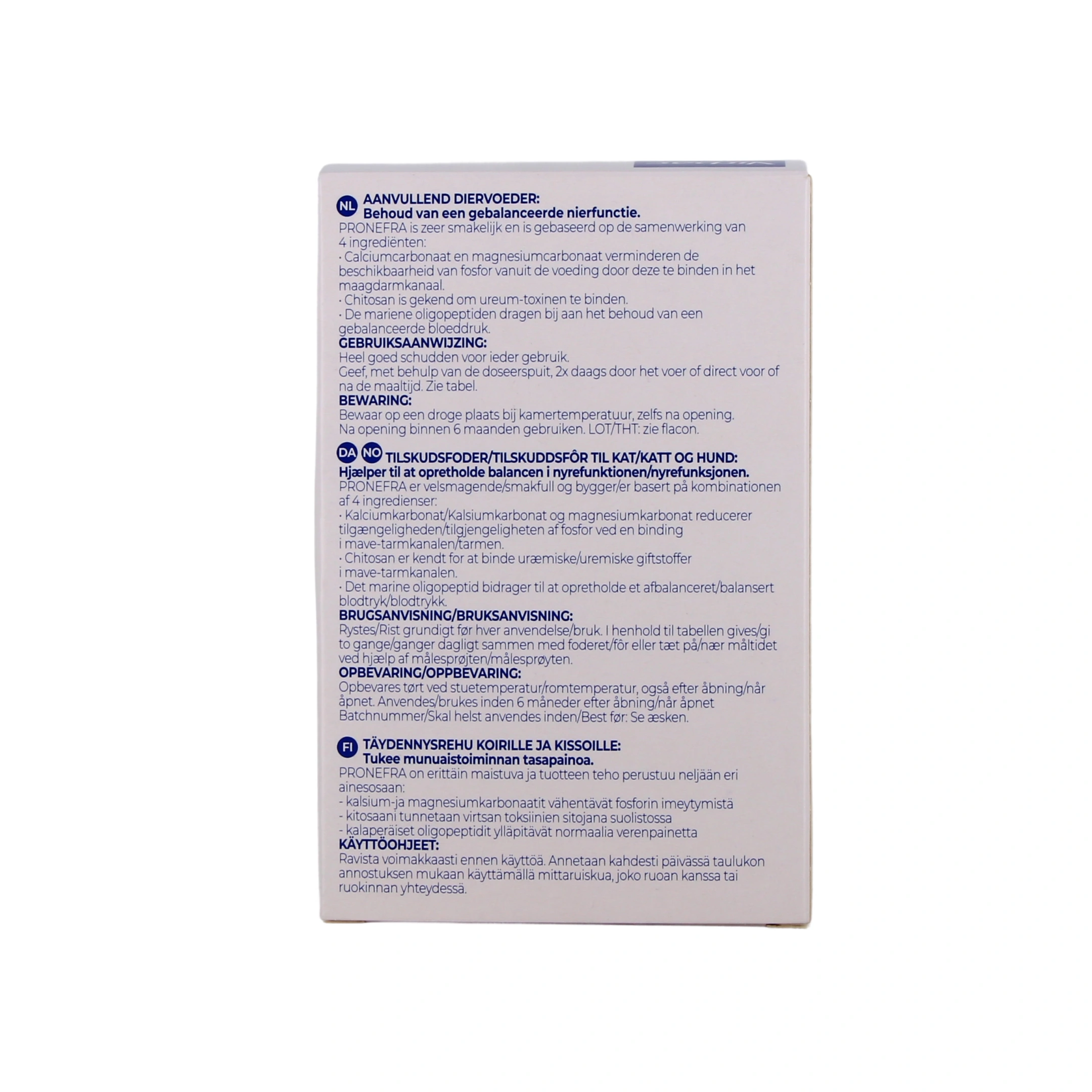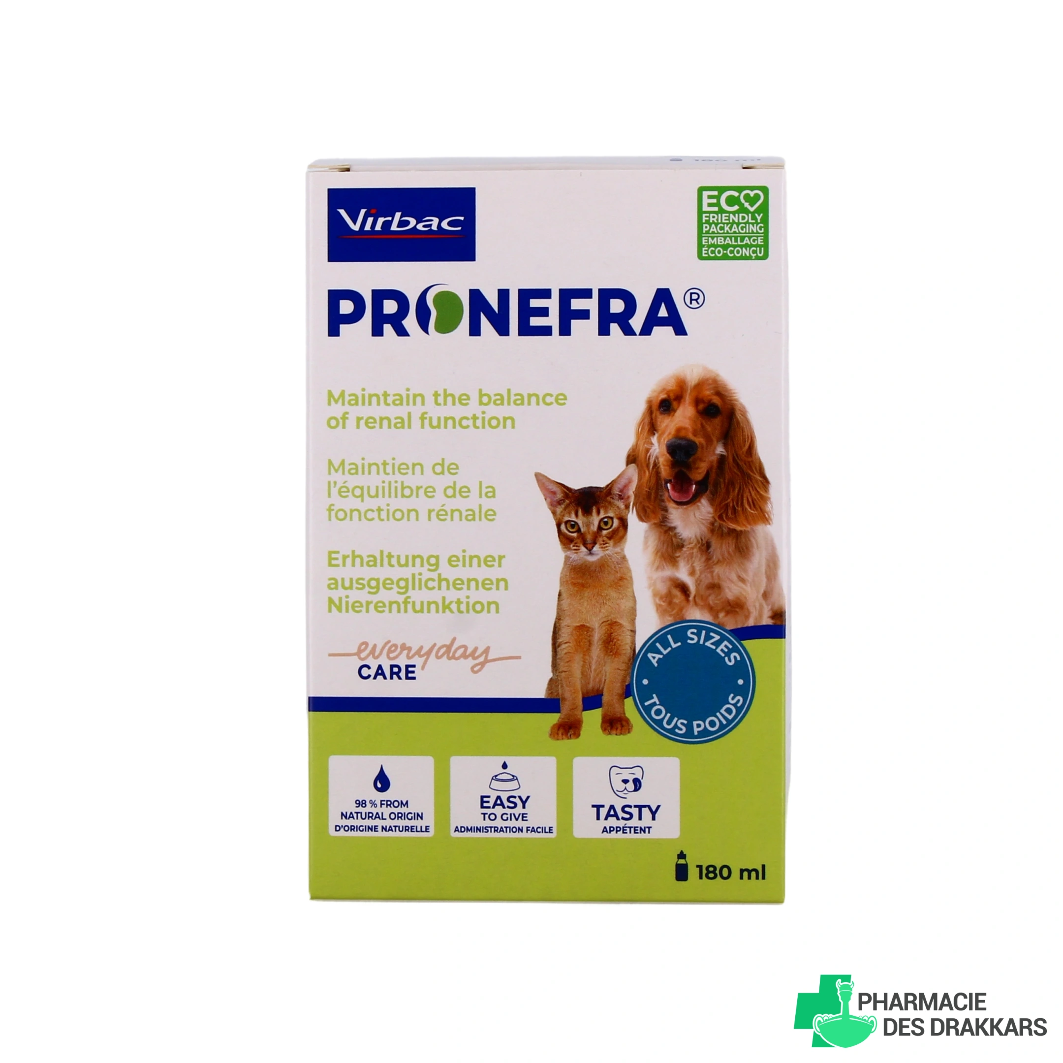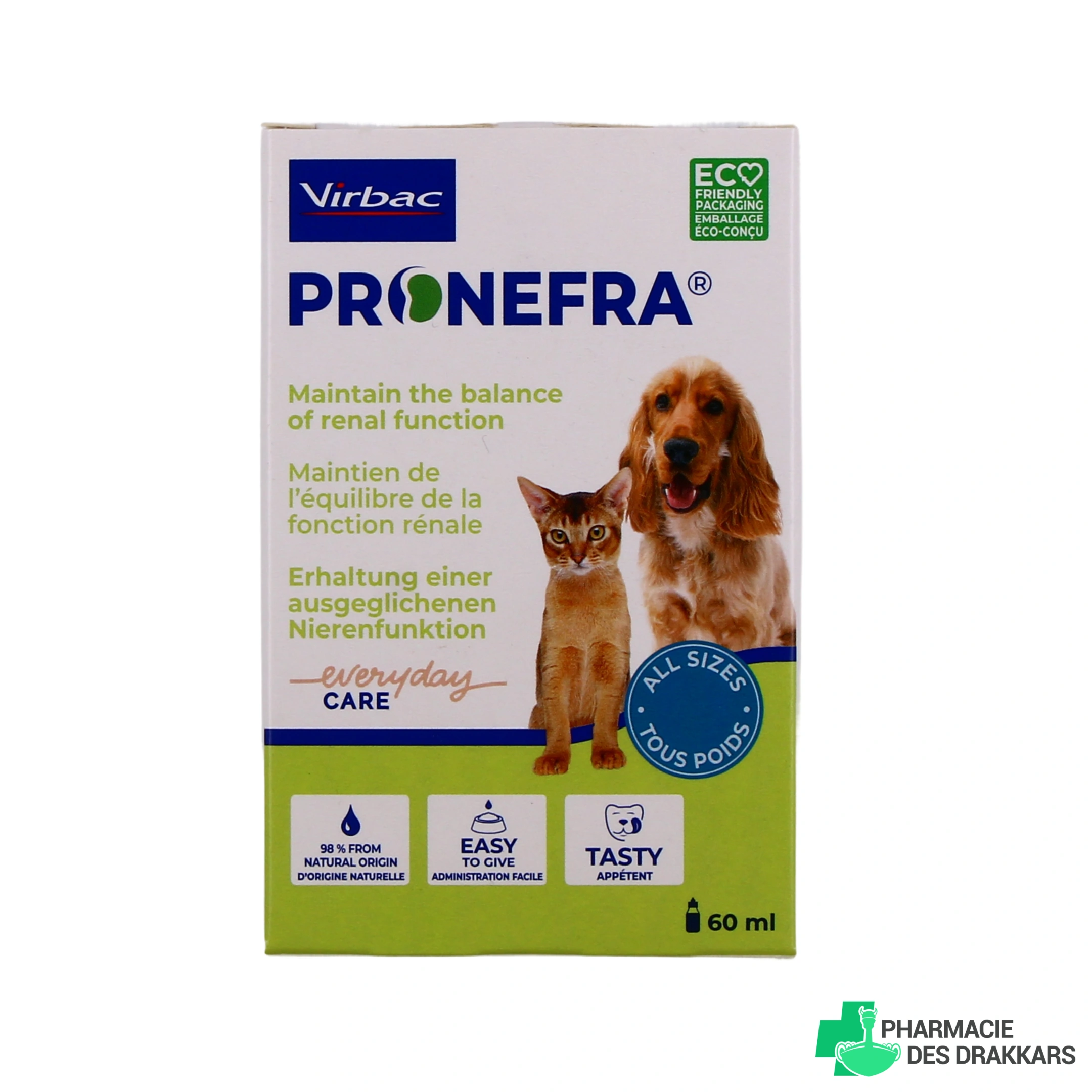 Conçu pour tous les chiens et les chats, quel que soit leur poids, Virbac Pronefra a pour but de maintenir l'équilibre de la fonction rénale. Ce complément alimentaire se présentant sous la forme d'une solution buvable accompagnée d'une seringue graduée se distingue par son appétence qui permet de l'administrer facilement.