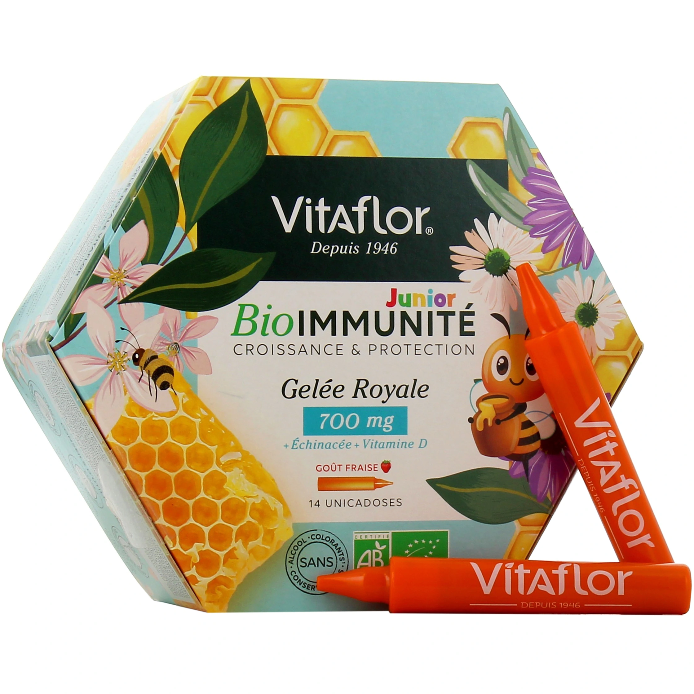 Vitaflor Gelée Royale Bio 700 mg Défense + Junior est un complément alimentaire destiné aux enfants dès l'âge de 6 ans pour soutenir les défenses immunitaires et la croissance.