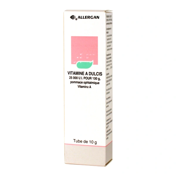 Vitamine A Dulcis Pommade Ophtalmique est un médicament cicatrisant oculaire dont le principe actif est la vitamine A (25 000 UI pour 100 g de pommade).