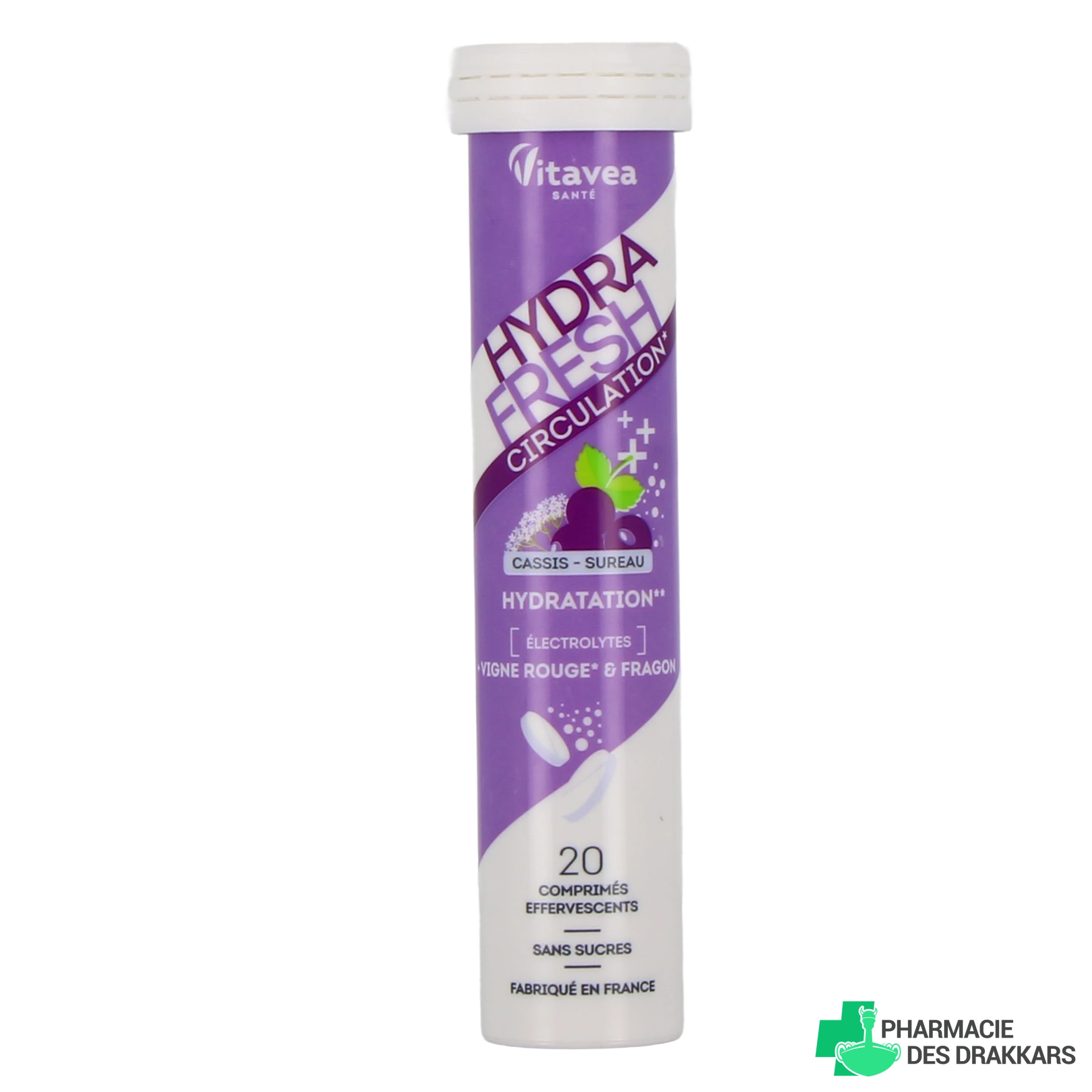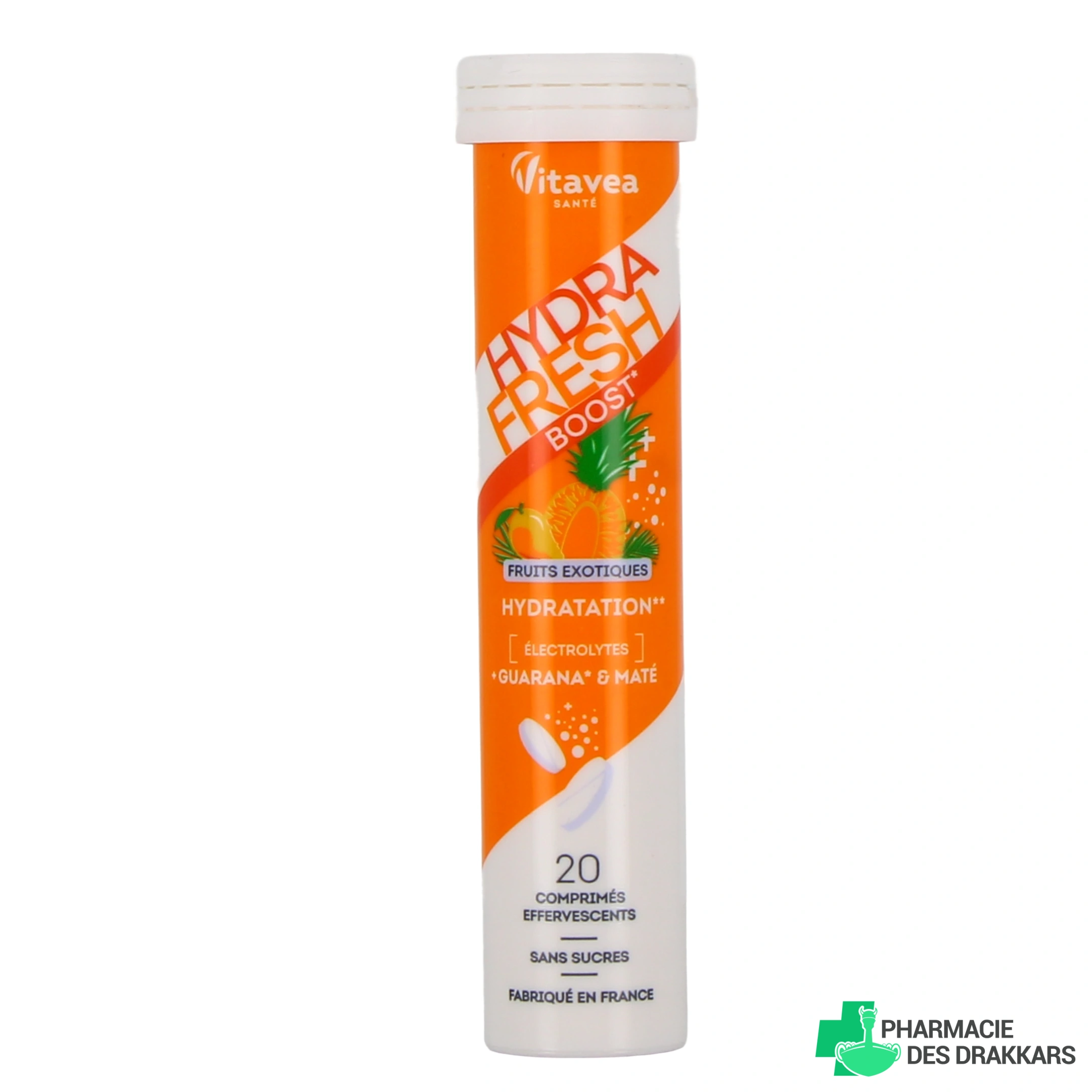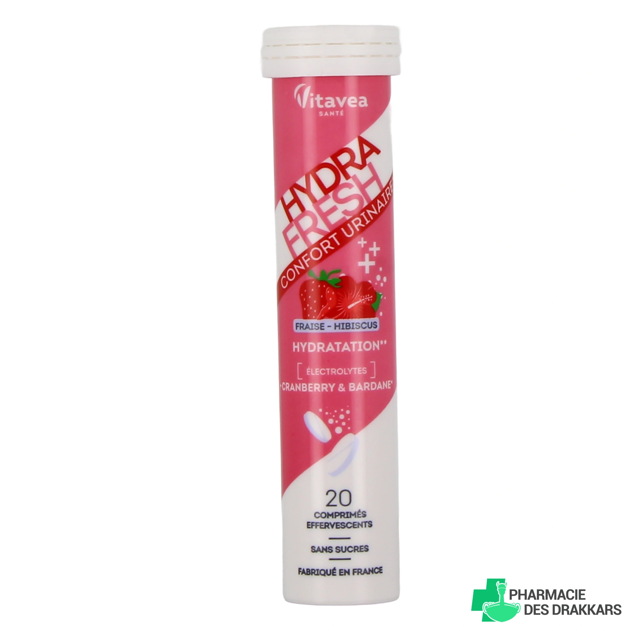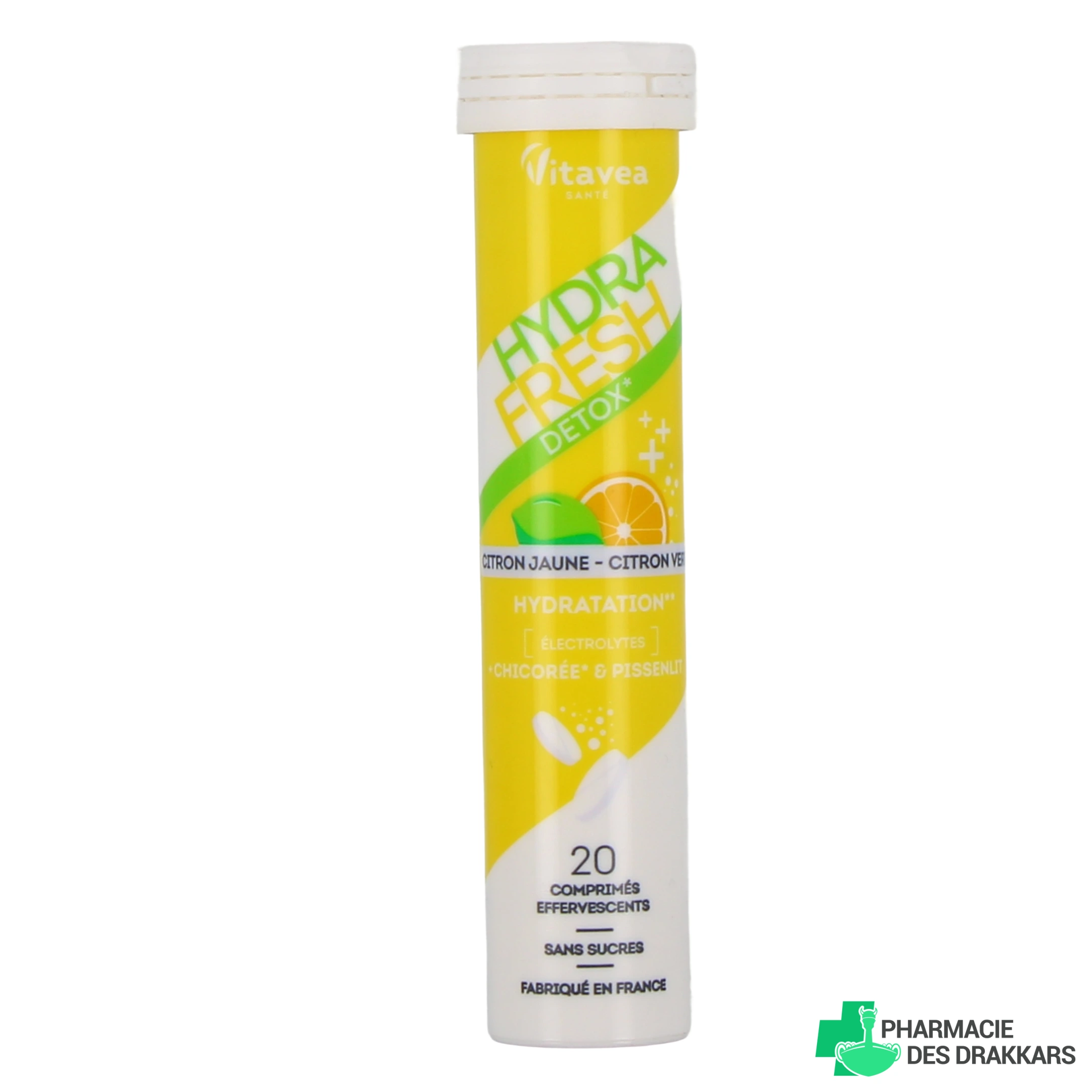 Présentation disponible sur notre pharmacie en ligne pour Hydrafresh Vitavea : tube de 20 comprimés effervescents, arôme au choix.