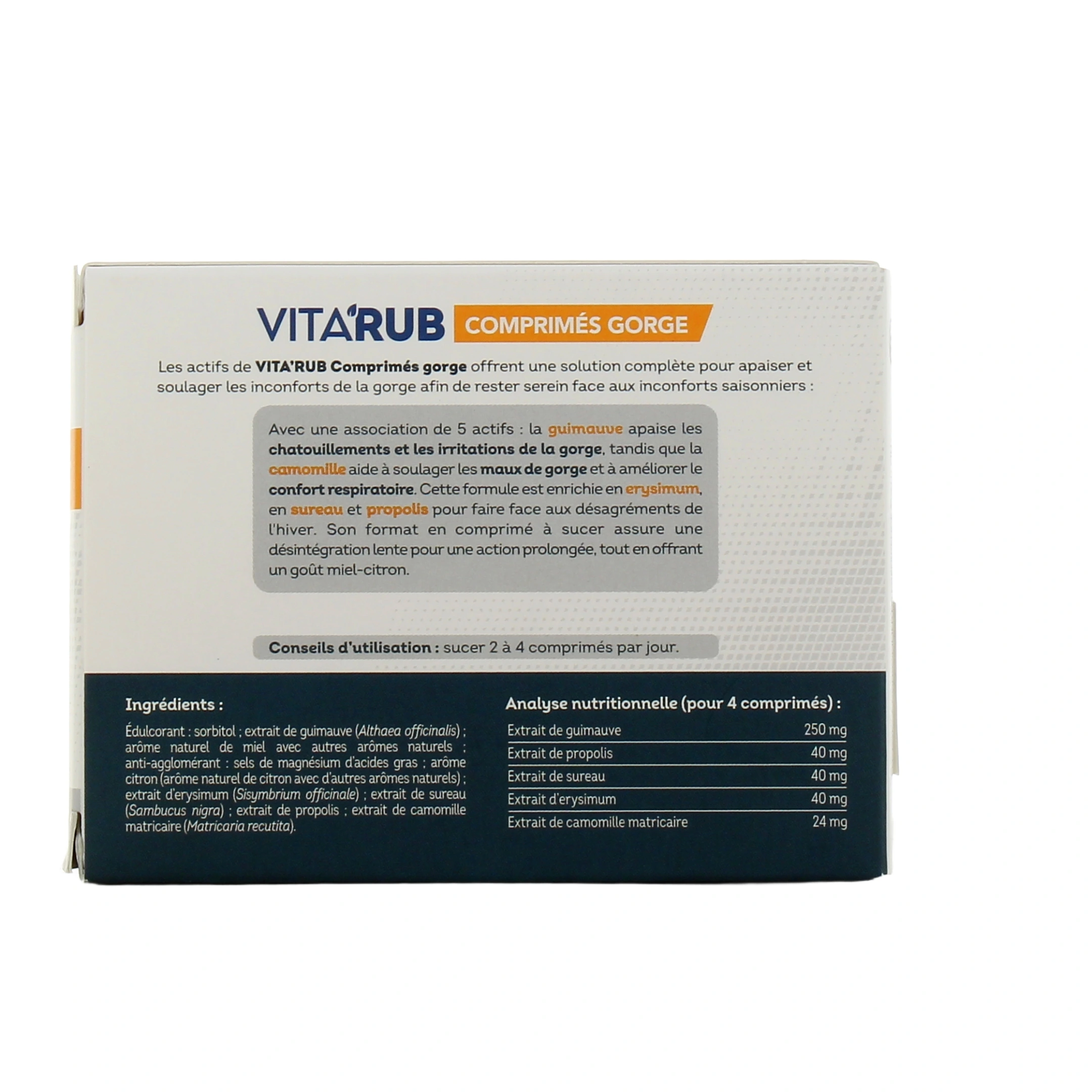 Formulé avec 5 extraits végétaux dont de la guimauve, de la camomille, de l'érysimum, du sureau et de la propolis, les comprimés Vita'Rub maux de gorge sont un complément alimentaire qui contribue à apaiser la gorge et les enrouements, à soutenir les défenses naturelles et agit sur le confort respiratoire :