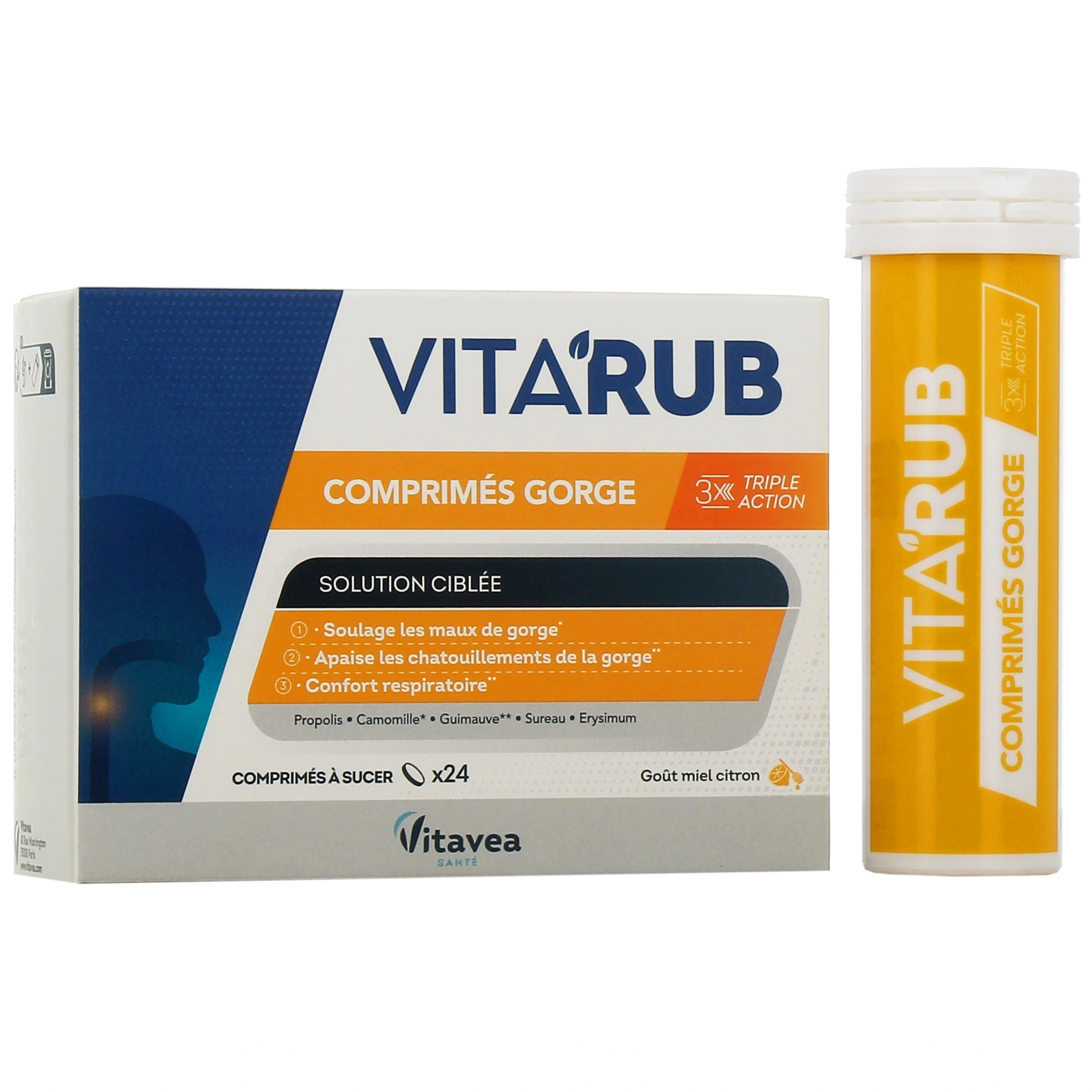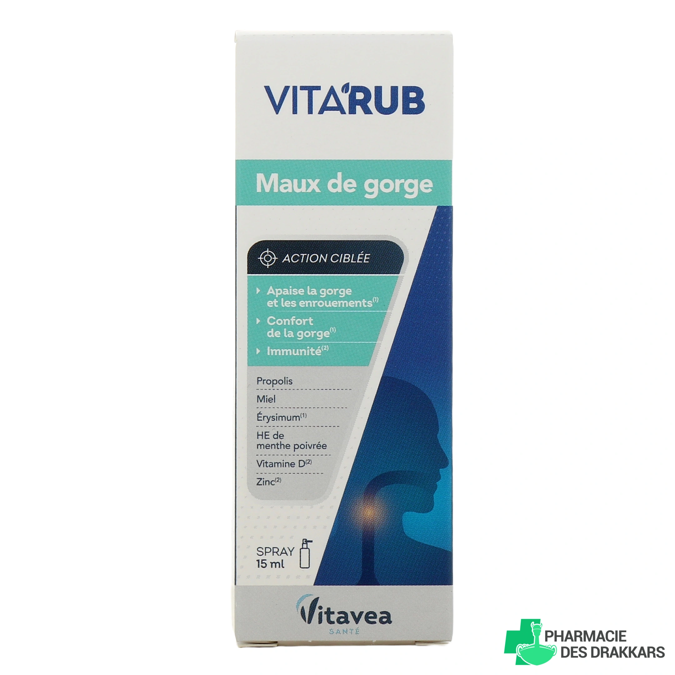 Vita'Rub Maux de Gorge est un complément alimentaire mis au point par Vitavea et indiqué en cas de maux de gorge. Il repose sur une synergie d'actifs soigneusement sélectionnés pour aide à soulager les inconforts de la gorge et se présente sous la forme de spray ou de comprimés à sucer.