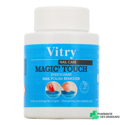 Le dissolvant Magic Touch de Vitry est à retrouver dans les présentations suivantes sur notre pharmacie en ligne : flacon de 75 ml.