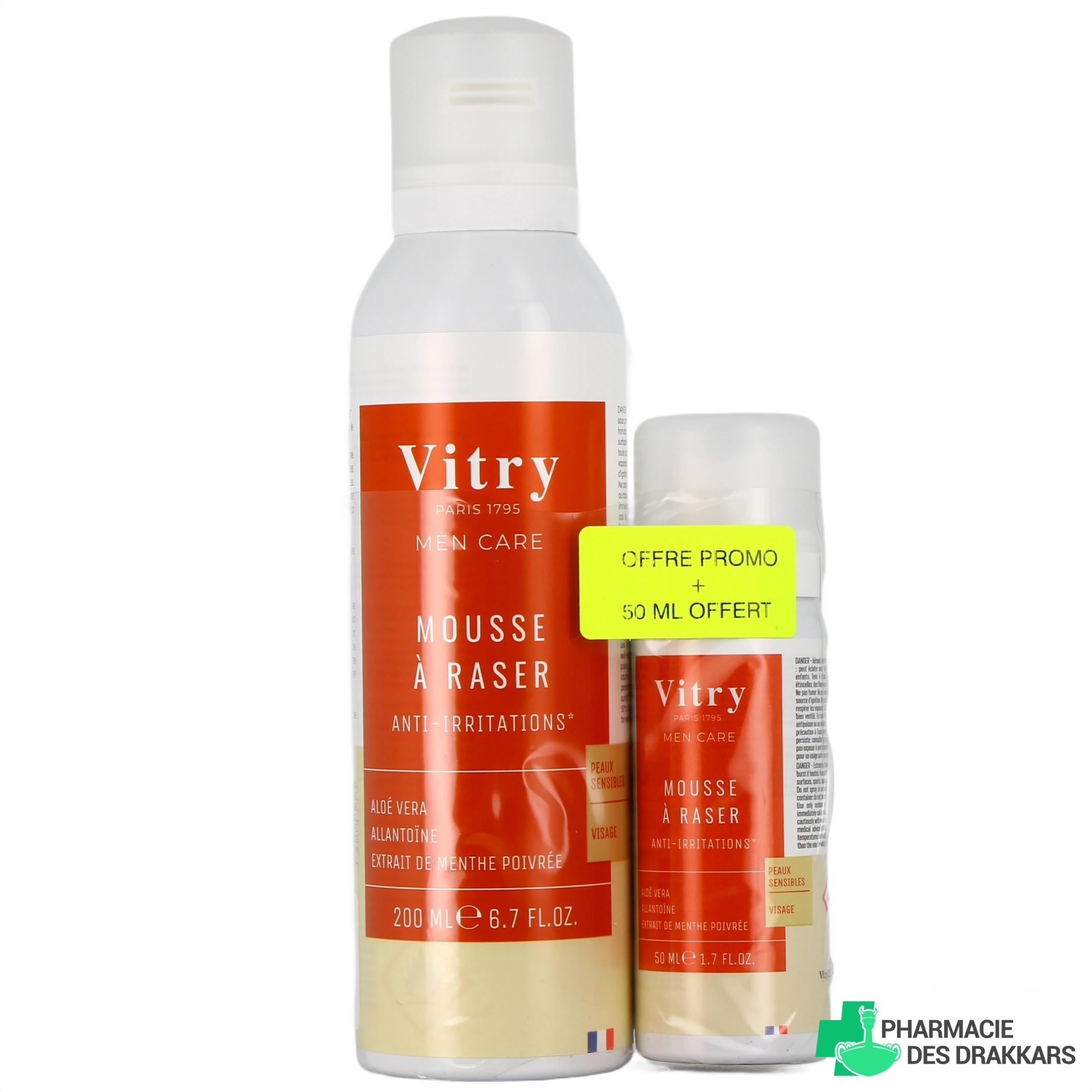 Vous pourrez retrouver la mousse à raser Peaux Sensibles de Vitry dans les présentations suivantes sur notre pharmacie en ligne : Offre promo - Flacon de 200 ml + 50 ml offerts.