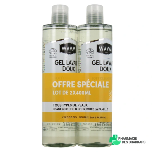 Présentation proposée par votre pharmacie en ligne pour la base de gel lavant doux Waam : Flacon de 400 ml ou lot de 2 flacons de 400 ml.