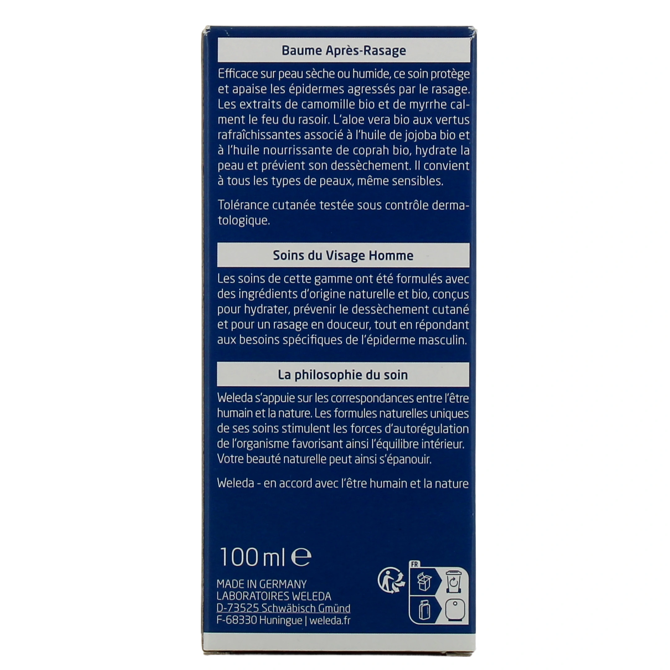 Pour éviter les irritations ainsi que les sensations de tiraillements, un soin doit être appliqué après chaque rasage. C'est pourquoi Weleda a mis au point son baume après-rasage pour homme : ce soin protège et apaise la peau agressée par le rasage. L'extrait de camomille et de myrrhe apaise le feu du rasage en apportant hydratation et fraîcheur à l'épiderme. L'extrait d'huile de jojoba et l'huile nourrissante de coprah préviennent le dessèchement cutané. Le gel d'Aloe Vera, quant à lui, hydrate, protège et rafraîchit intensément la peau du visage.