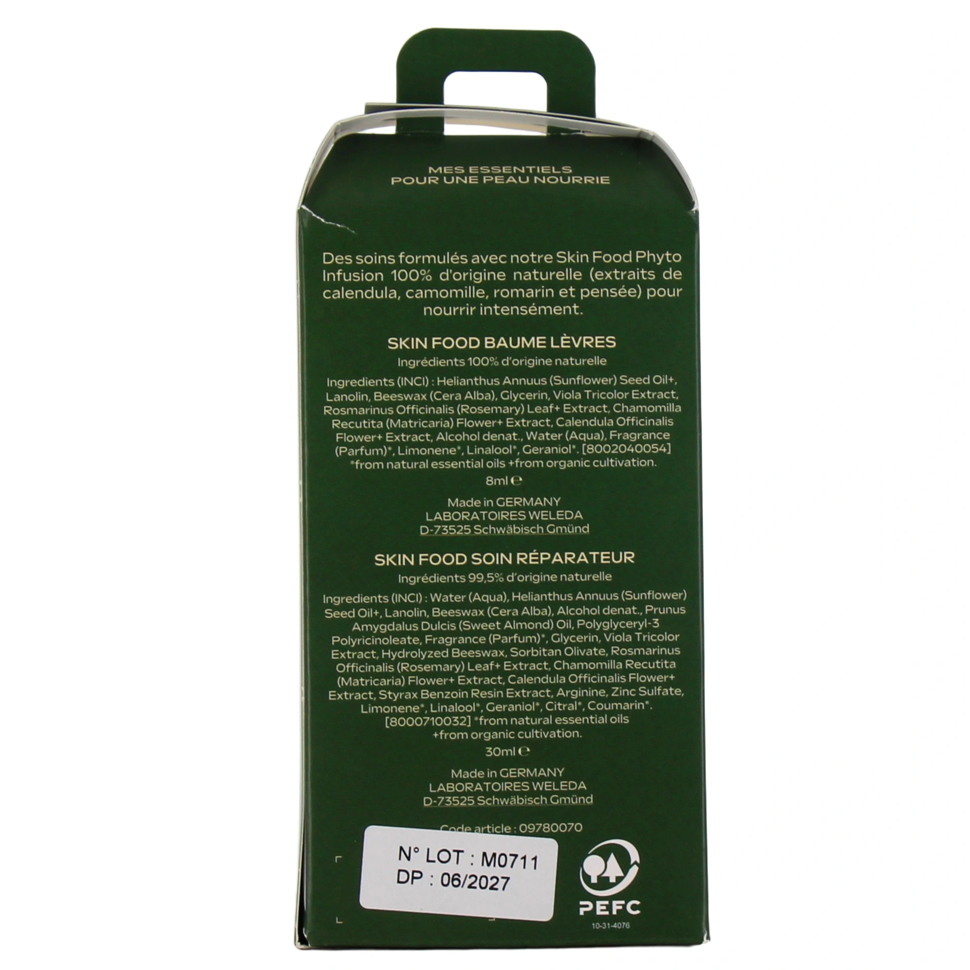Pour une peau intensément nourrie, Weleda a conçu un coffret comportant deux soins formulés avec la Skin Food Phyto Infusion d'origine naturelle. Le baume lèvres skin food est un soin pour les lèvres sèches et gercées qui les protège du dessèchement, les répare et les nourrit intensément. De son côté, le soin réparateur skin food répare les zones agressées et rugueuses, notamment au niveau des coudes, des genoux ou encore des talons.
