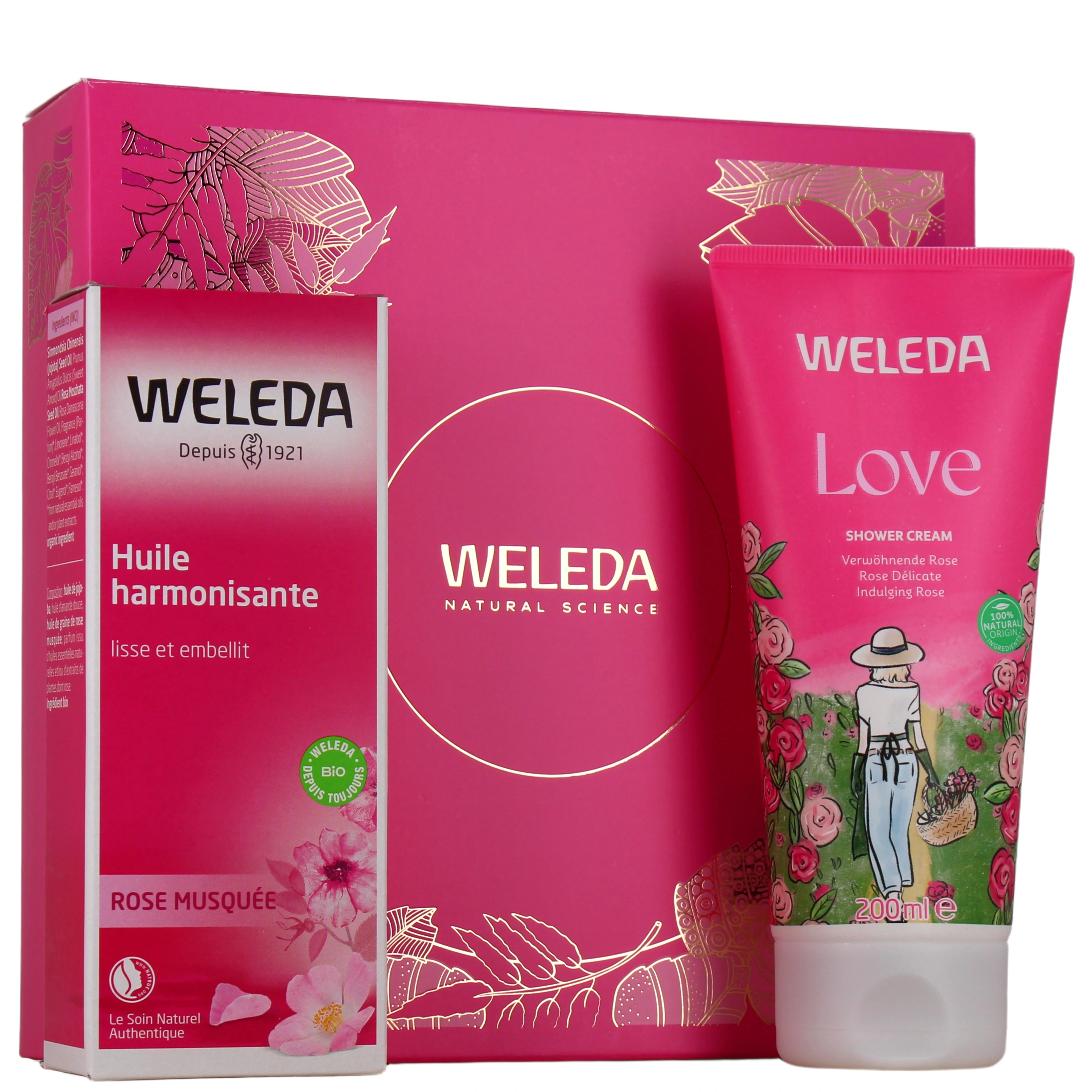 - Weleda Coffret Rose : 1 huile harmonisante 100 ml + 1 crème de douche love 200 ml ;