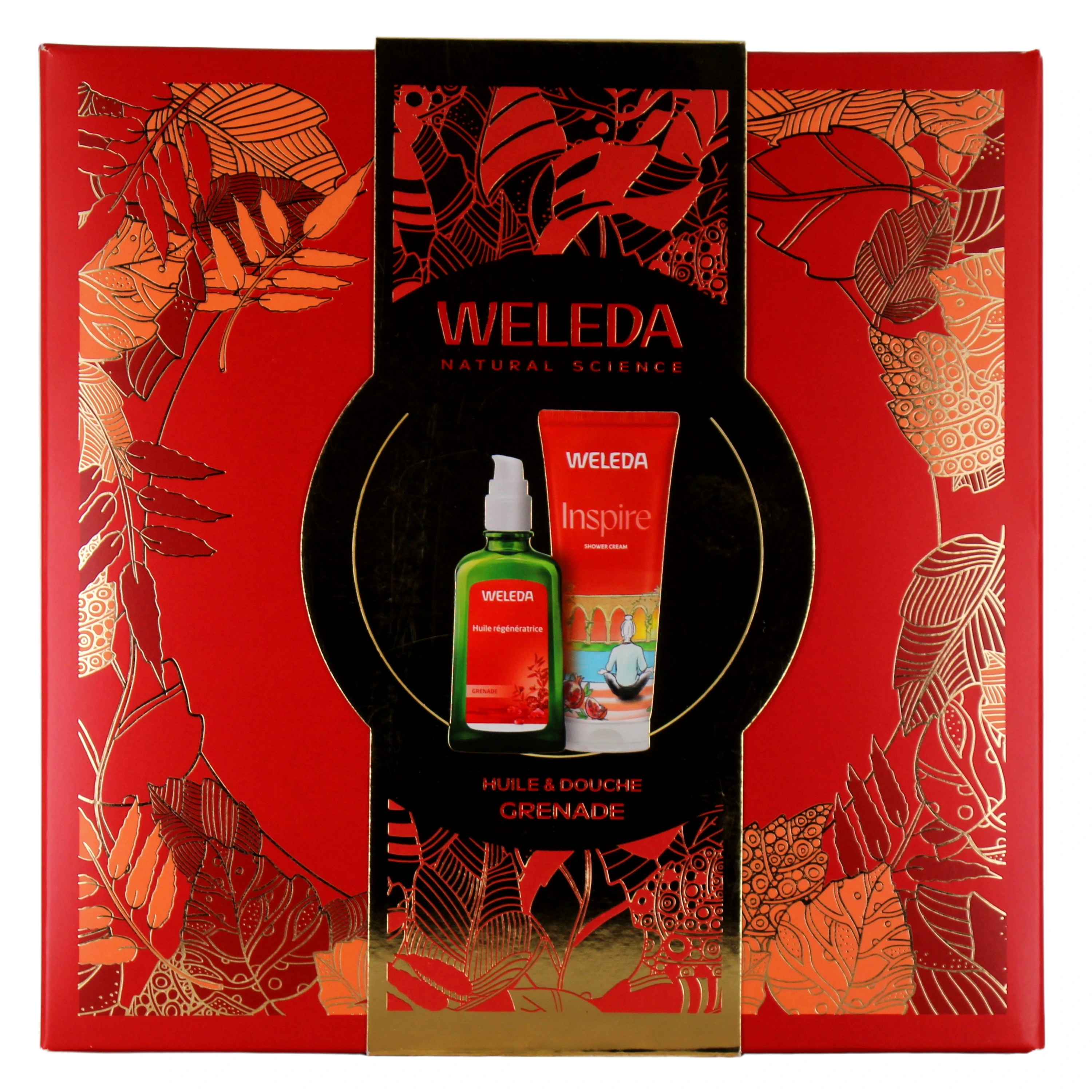 - Weleda Coffret Grenade : 1 huile régénératrice 100 ml + 1 crème de douche inspire 200 ml ;
