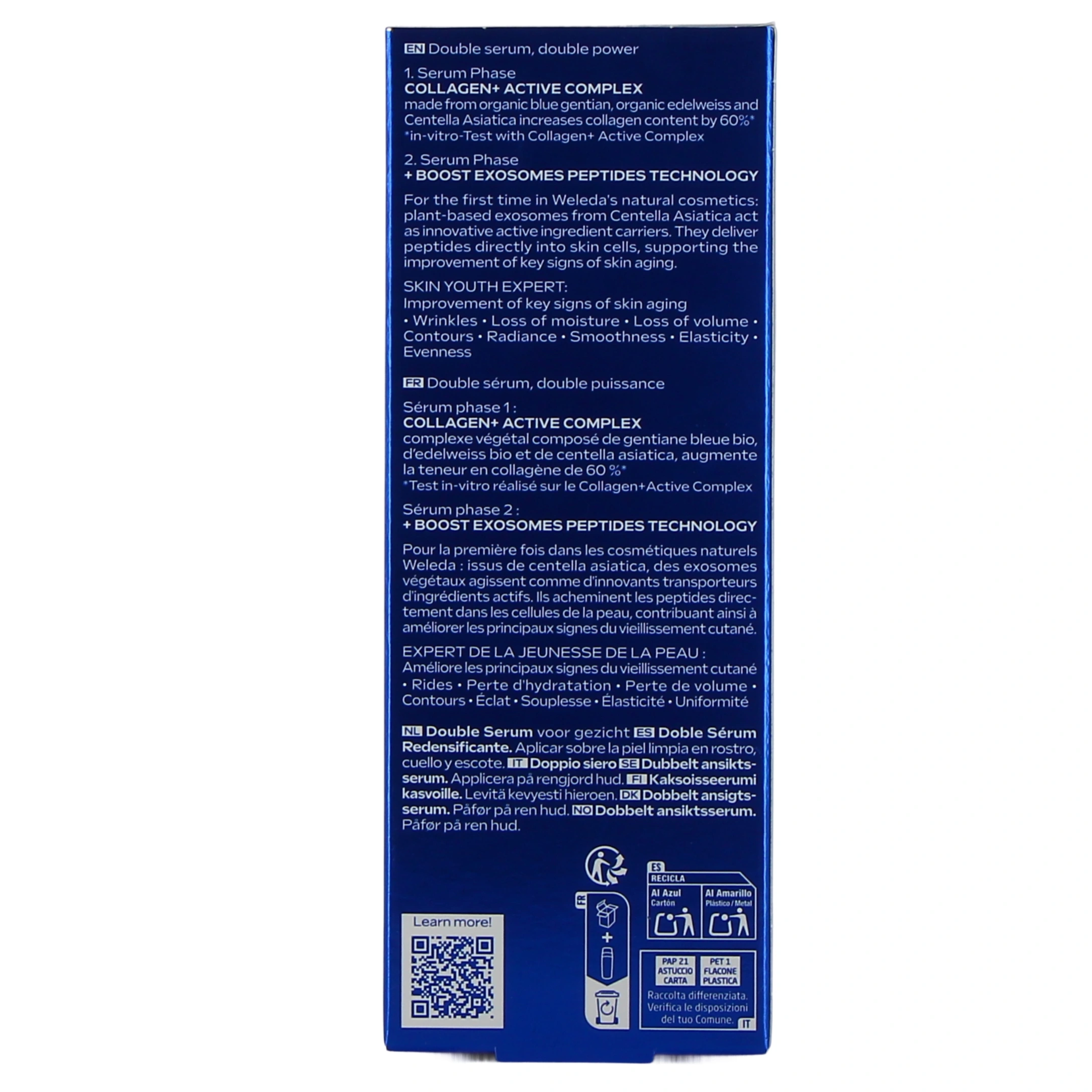 Au cœur de la formule du double sérum Weleda, deux phases complémentaires agissent en synergie pour maximiser ses effets. La première phase, enrichie en complexe végétal Collagen+ associe gentiane bleue bio, edelweiss bio et centella asiatica afin de stimuler la production naturelle de collagène et renforcer la fermeté de la peau. La seconde phase repose sur la technologie Exosomes Peptides, des exosomes végétaux issus de la centella asiatica qui agissent comme des transporteurs d'actifs innovants. Ils permettent d'acheminer les peptides directement au sein des cellules cutanées afin de cibler plus efficacement les signes de l'âge.