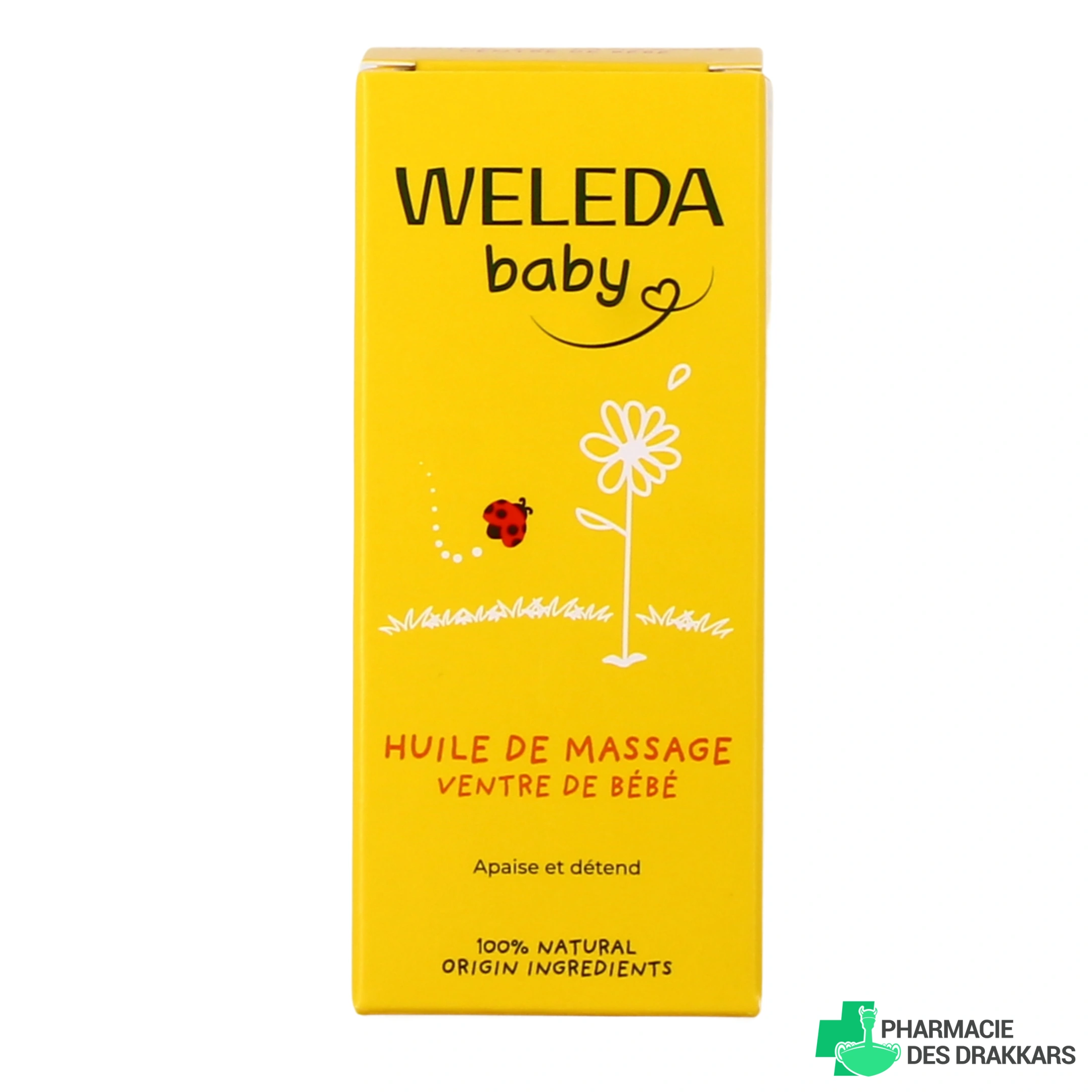 Conditionnement proposé par votre pharmacie en ligne : flacon en verre de 50ml d'huile de massage pour le ventre de bébé Weleda.