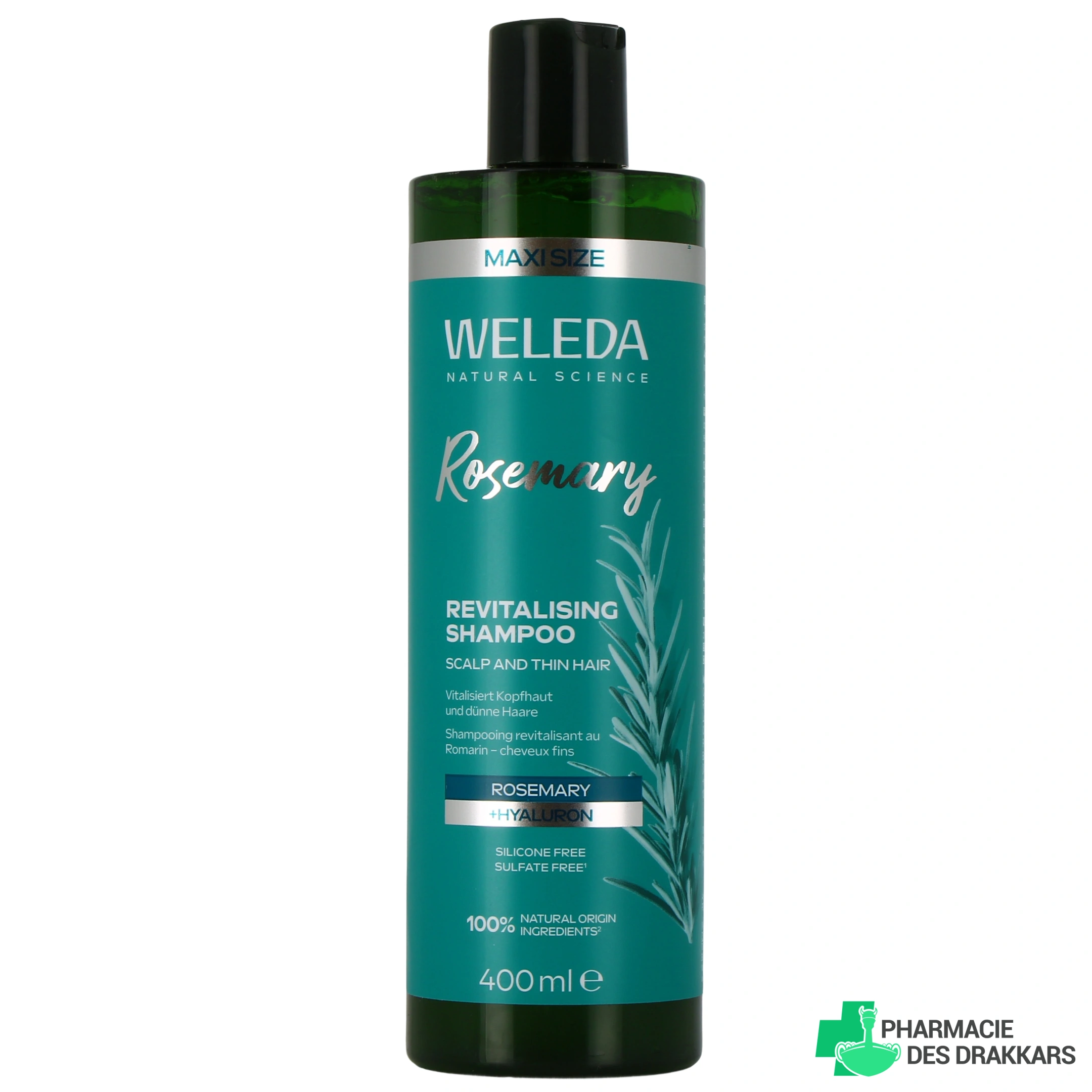 Vous pourrez sélectionner le shampooing revitalisant au romarin de Weleda parmi les présentations suivantes chez Pharmacie des Drakkars : flacon de 250 ou de 400 ml.