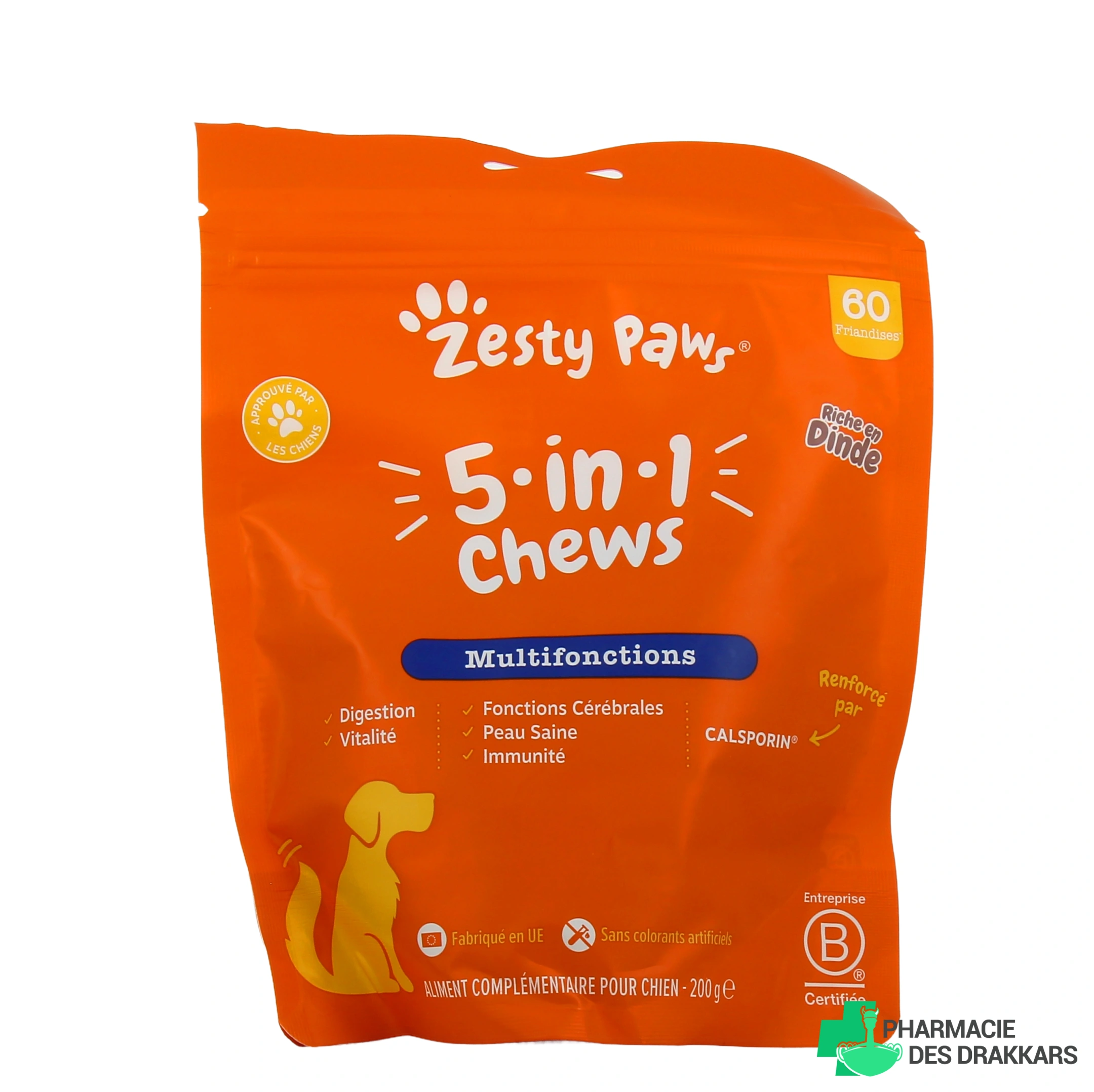 Zesty Paws Multifonctions est un complément alimentaire 5 en 1 pour chien destiné à améliorer les fonctions digestives, la performance physique, la fonction immunitaire, cérébrale, la santé de la peau et la beauté du pelage de votre animal.